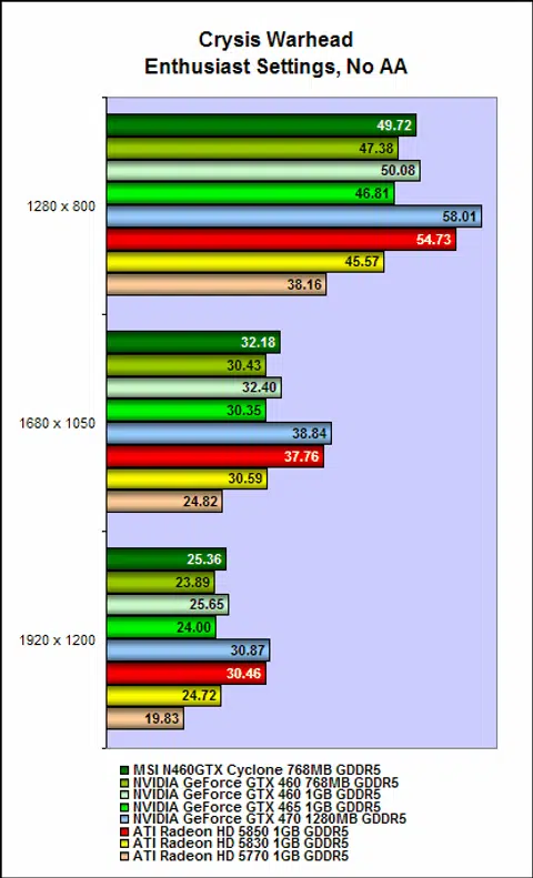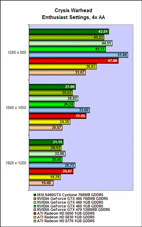 On Crysis Warhead, the MSI N460GTX Cyclone was markedly quicker than the reference 768MB GeForce GTX 460. Overall, its uprated clock speeds gave made it on average about 5% quicker. It also came close to the 1GB reference GeForce GTX 460, even with anti-aliasing enabled.
