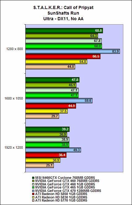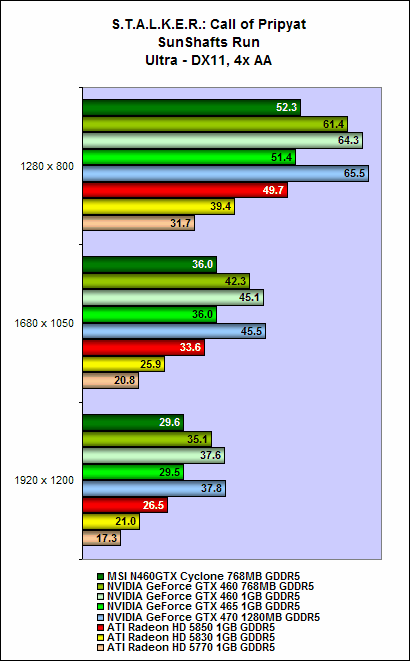 The MSI N460GTX Cyclone continued to be faster than the reference 768MB card and kept pace nicely with the 1GB reference card. However, we did notice that it performed quite poorly on the Sunshafts run with anti-aliasing enabled. We are attributing this discrepancy to the new ForceWare 258.96 drivers, and will be paying close attention to this particular run in our future tests of the GeForce GTX 460.