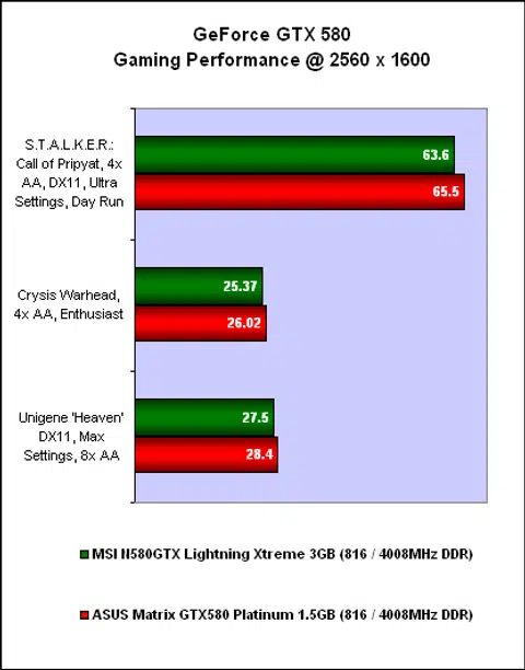To find out if the 3GB of memory on the MSI Lightning Xtreme actually does anything (and a valid reason for us to test our new 30-inch display, which has a native resolution of 2560 x 1600 pixels), we tested the MSI Lightning Xtreme and the ASUS Matrix GTX580 Platinum at the same clock speeds. That meant bringing down the faster core and memory clocks of the MSI to the same 816MHz (core) and 4008MHz DDR (memory) as the ASUS Matrix.