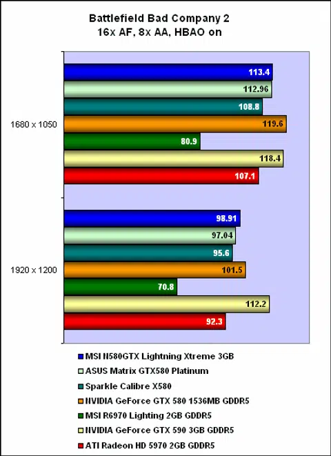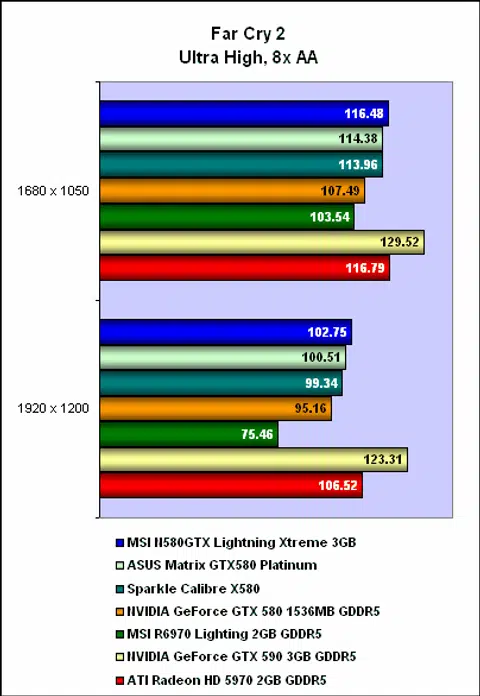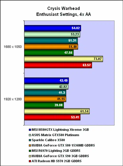 With its slightly higher clocks out of the box, it was no surprise that the MSI Lightning Xtreme had the lead over the other overclocked GTX 580 cards from ASUS and Sparkle. The differences were marginal though and translated to a couple of frames at best.