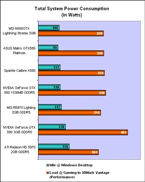 When it came to the GPU core temperature, we found that the MSI Lightning recorded an identical 58.0 degrees Celsius as the ASUS Matrix. This was pretty impressive and coupled with the almost-silent Twin Frozr III cooler, this MSI card certainly matched up to our expectations. The power draw of this MSI card was also mostly on par with the other GTX 580 cards, though the ASUS Matrix had a slight advantage here when idling.