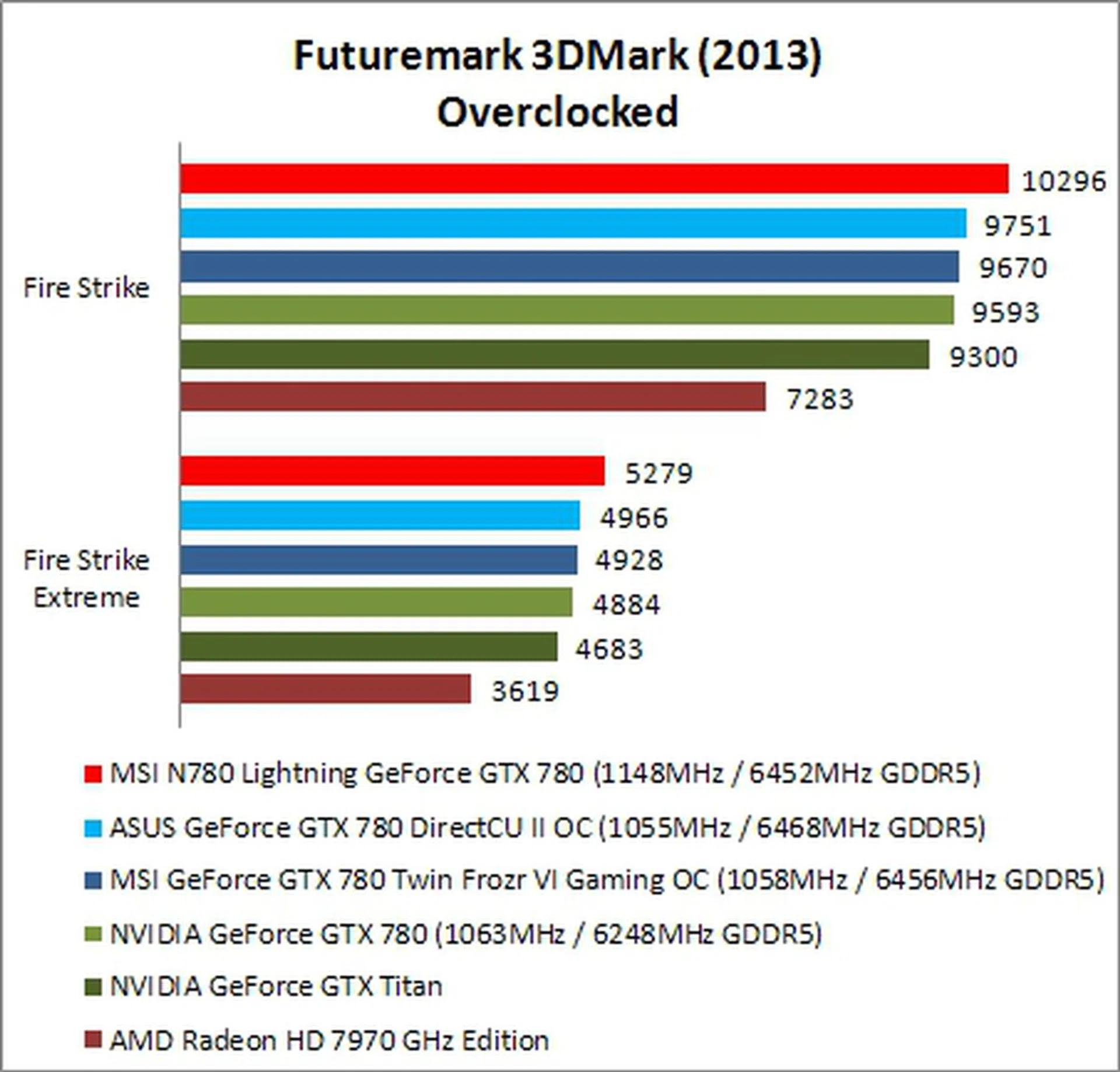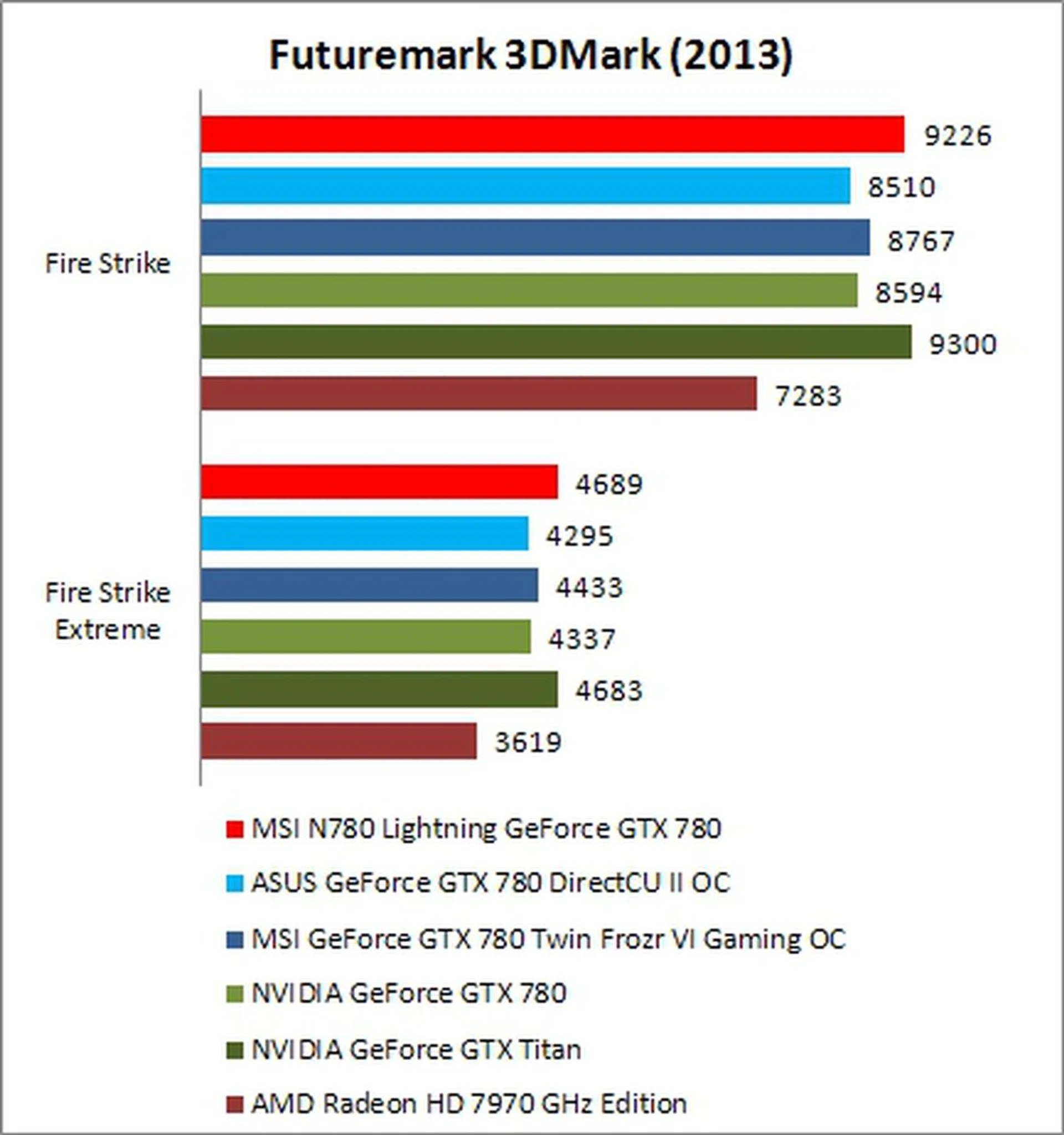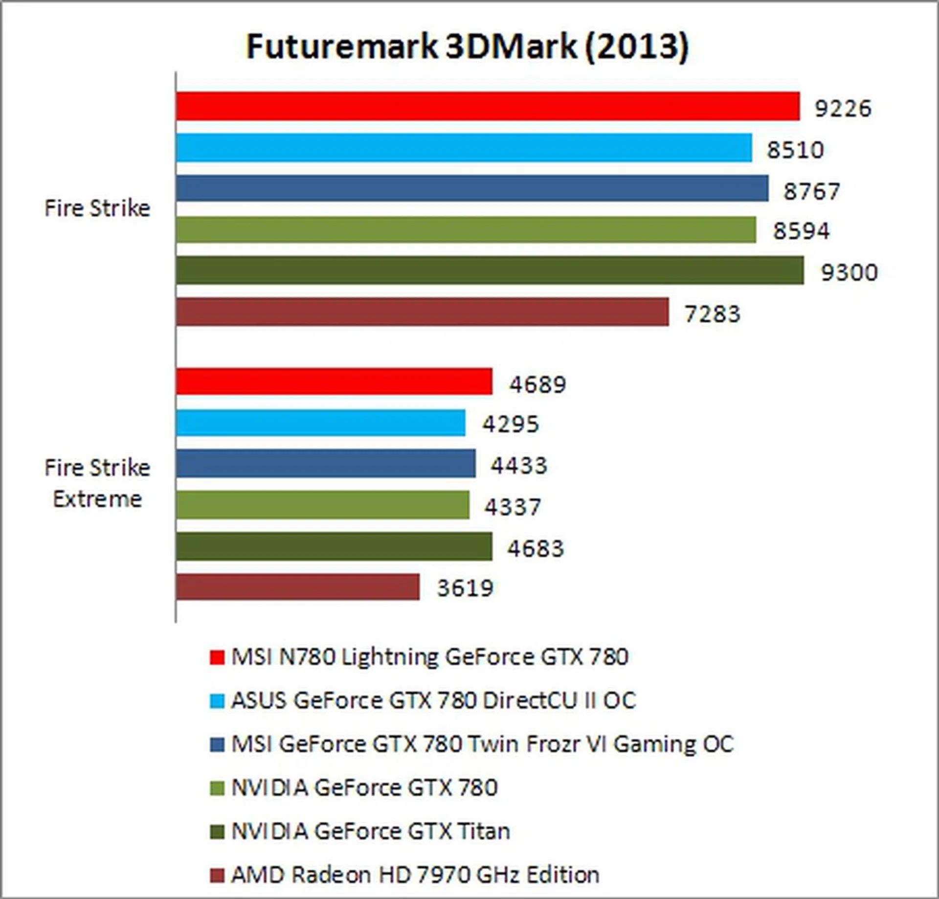 The clear winner for this benchmark is the MSI N780 Lightning in comparison with the other custom GTX 780 cards, with a winning margin in the range of 5- to slightly over 9%. This is expected as the winning card has a generously overclocked GPU. For the Fire Strike test, it was just a hair's breadth away from surpassing the GeForce GTX Titan. It managed to achieve a razor thin win over the Titan for the Fire Strike Extreme tests and we assume that this was just a lucky win by the N780 Lightning. In comparison with the AMD Radeon HD 7970, the N780 Lightning was approximately 29% better.