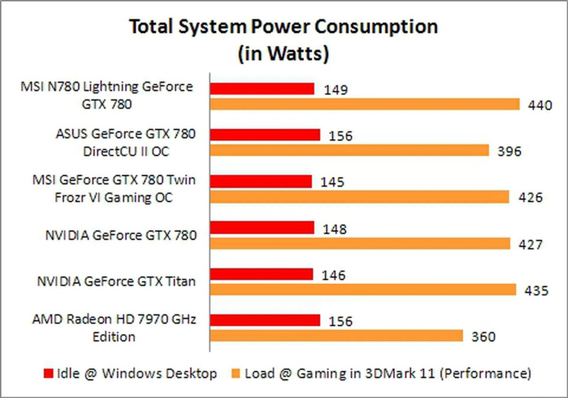 Its idle power draw of 149W made the MSI N780 Lightning card just second to the ASUS GeForce GTX 780 card that has the highest idle power draw of 156W. Under load, the N780 Lightning card drew the most power at 440W! Its power consumption profile is rather close to that of the GTX Titan.