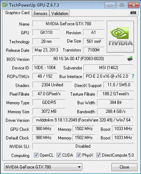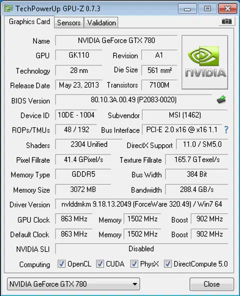 - MSI GeForce GTX 780 Twin Frozr Gaming 3GB GDDR5 (ForceWare 320.49)