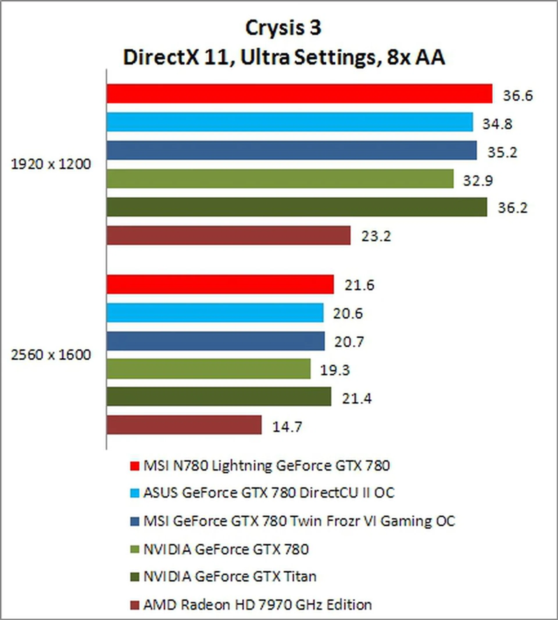 Besides gauging the performance of the card for artificial benchmarks, we also attempted to determine their performance for the graphically demanding game, Crysis 3. The MSI N780 Lightning emerged as the resounding winner in terms of in-game performance. It even managed to keep ahead of the GTX Titan by a thin margin of roughly 1%. Even at the lower resolution. the AMD card failed to maintain its average frame rate above 30fps.