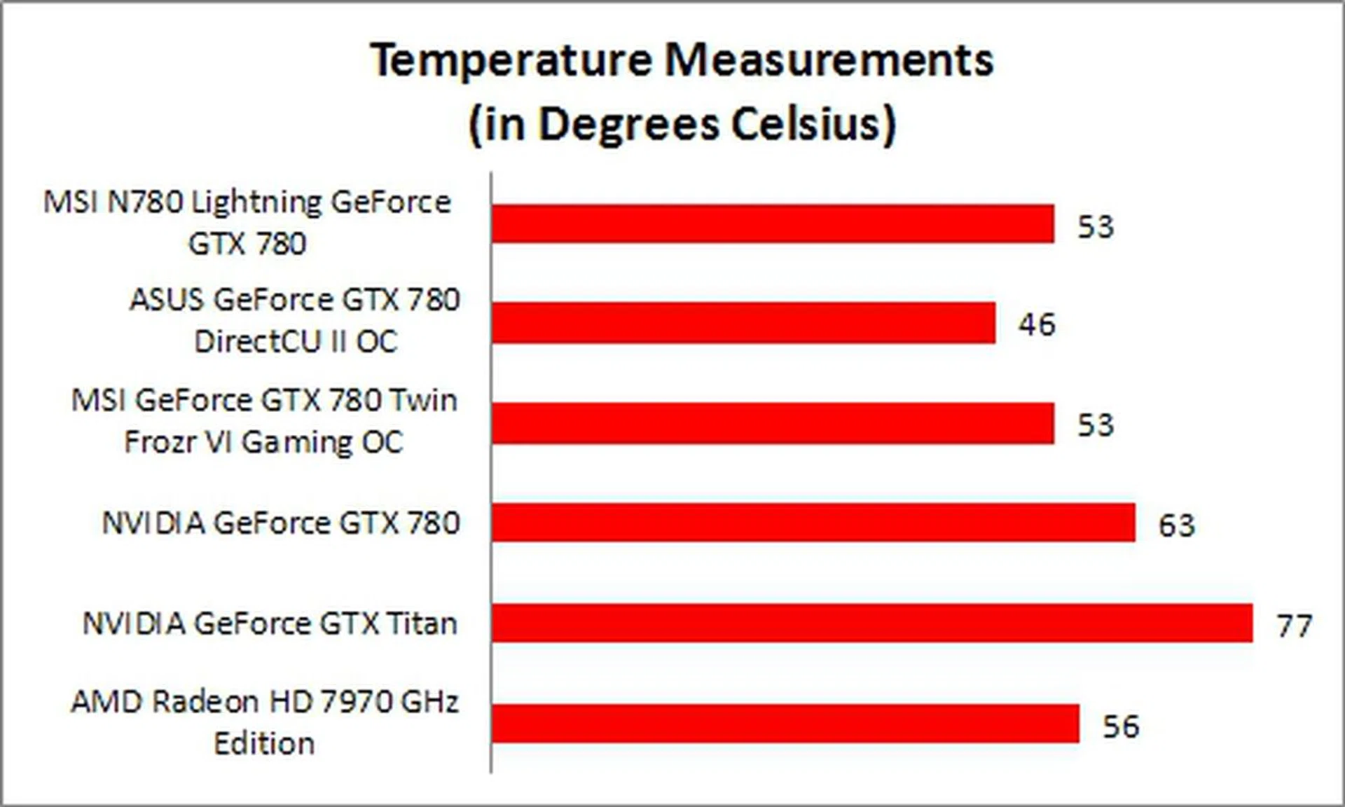 The custom cooling system of triple fans performed well to keep the N780 Lightning operating at 53 degrees Celsius. This was the second lowest temperature recorded of the cards under load. Coincidentally, the N780 Lightning card also registered the same operating temperature as its counterpart, the MSI GeForce GTX 780 Twin Frozr VI Gaming OC.