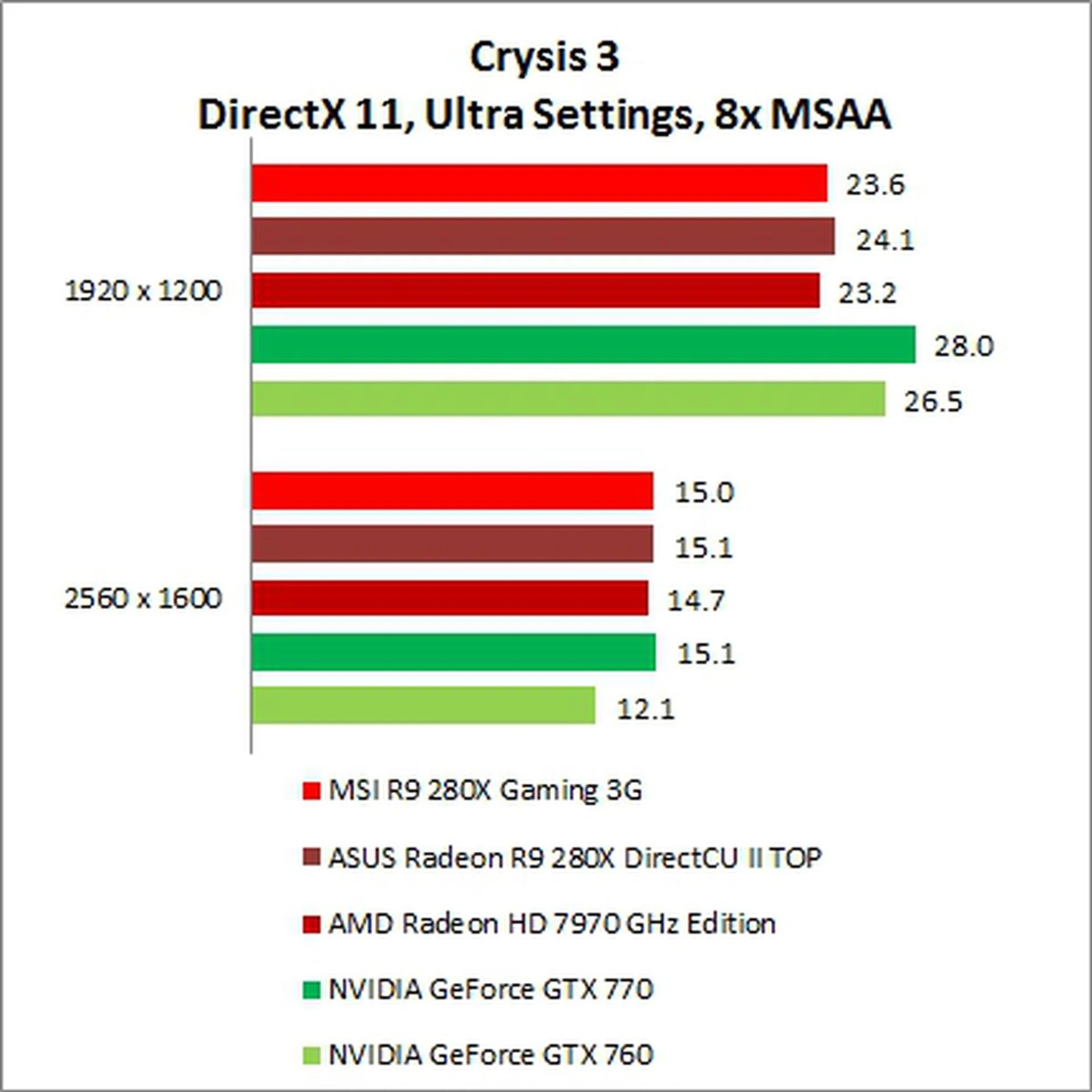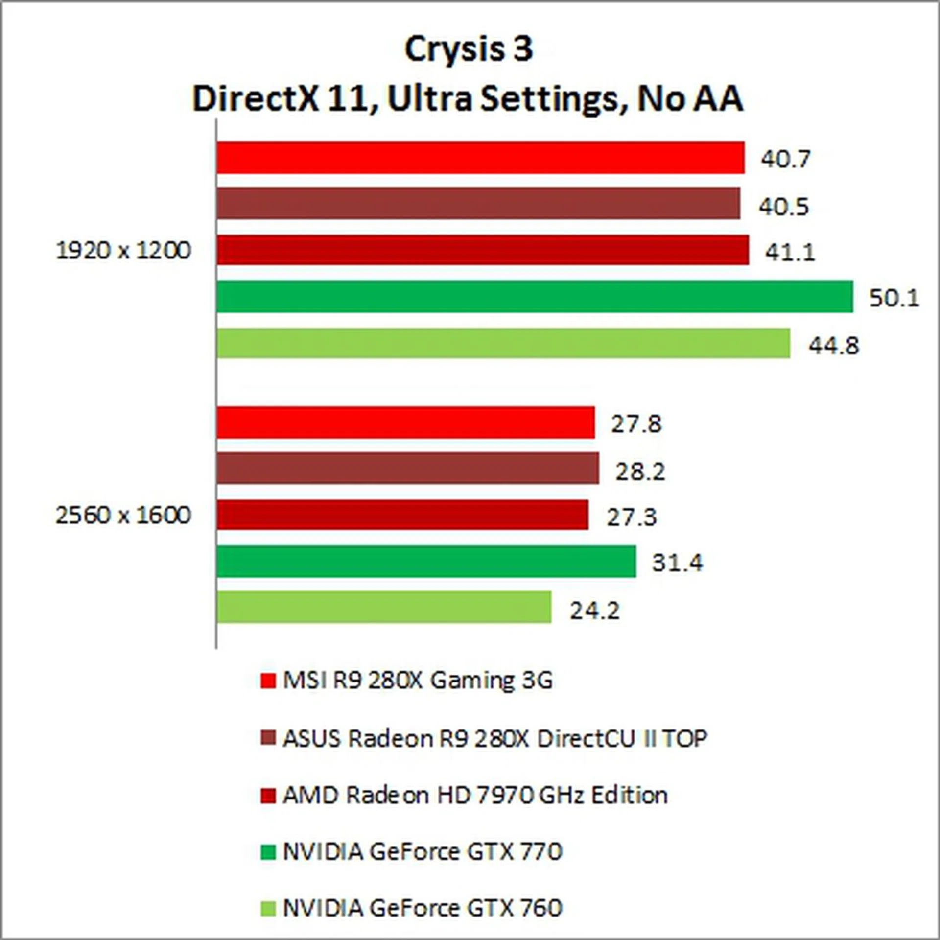 We put the cards through the Crysis 3 game title, to determine how well they handle the game's CryEngine 3, with extreme amounts of tessellation, per-pixel per-object motion blur, Bokeh Depth of Field, displacement mapping on small terrain, particle and volumetric lighting and fog shadows, dynamic cloth and vegetation, dynamic caustics and diffuse shadows.
