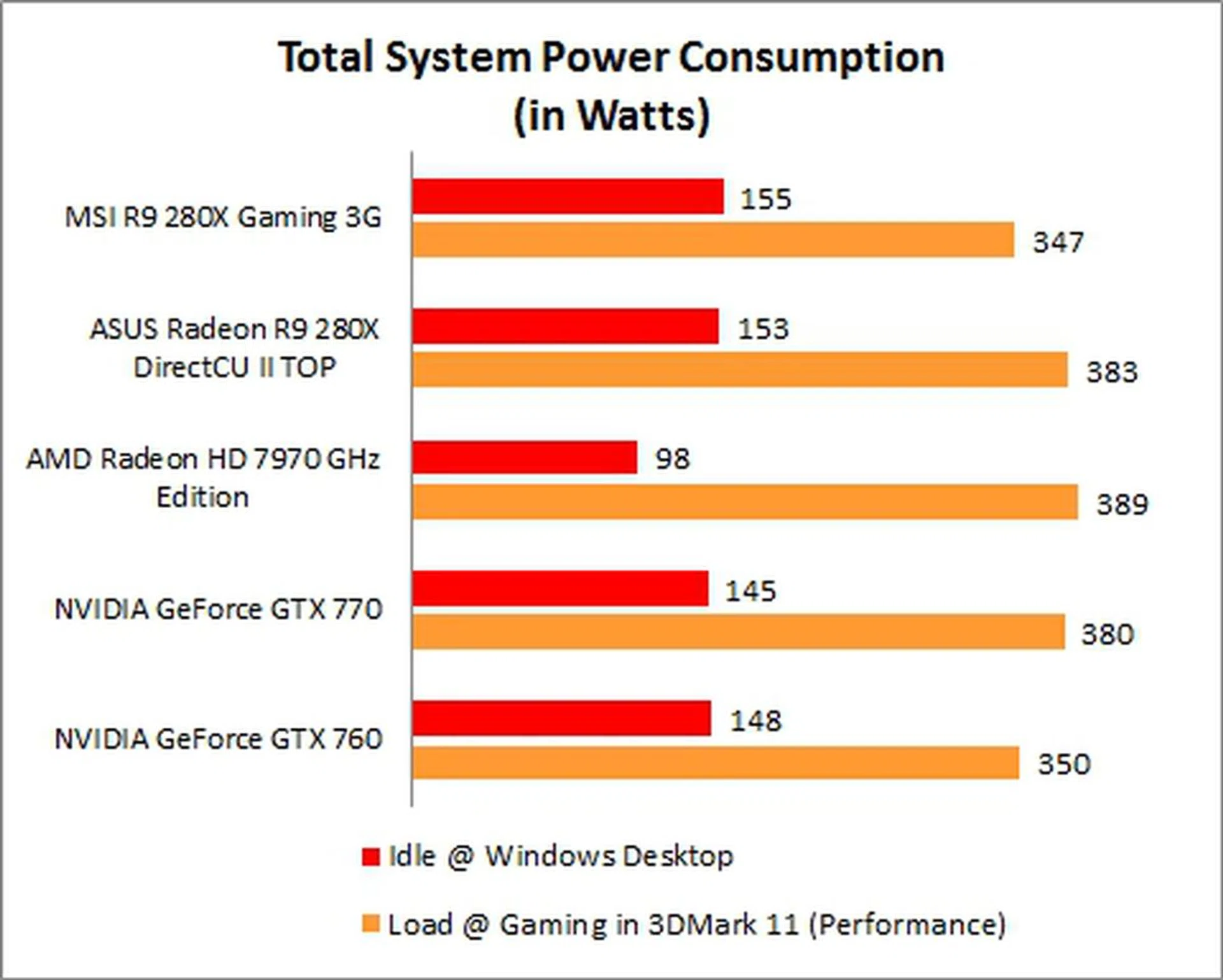 The MSI R9 280X card's idle power draw is only slightly higher than the ASUS card. But under load, the card's power consumption was lower by 9.4% than the ASUS card, at 347W. In comparison with the rest of the cards, the MSI R9 280X Gaming 3G card's power draw was the lowest, and registered a good difference between itself and the reference Radeon HD 7970 GHz edition too.