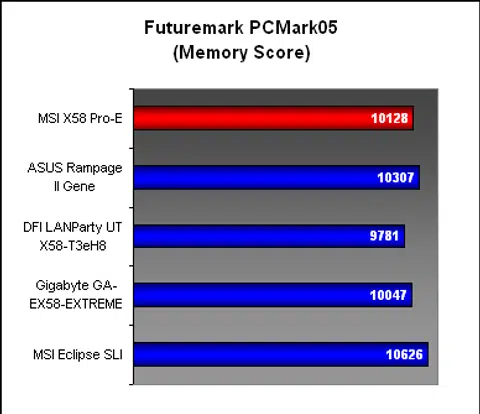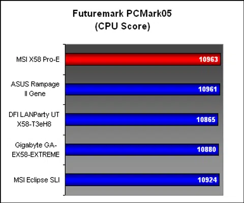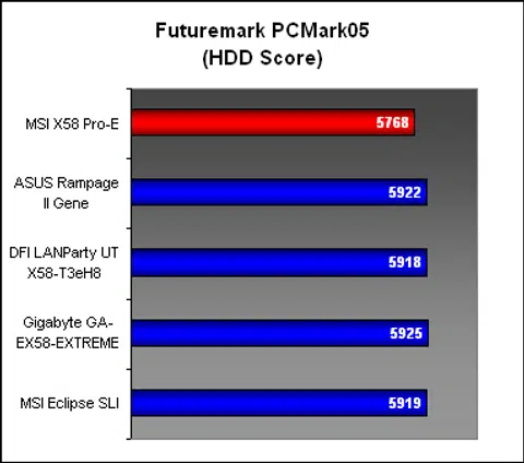 Moving onto the next system benchmark, PCMark05 Pro, we saw the MSI X58 Pro-E leading or posting results near the top of the pack for almost all the segments. The sole weakness was in the hard drive performance, which was significantly behind its competitors. This performance has added weight once we took in account the lower Productivity scores in SYSmark 2007. You can now better understand why the MSI X58 Pro-E took a small hit in its results in that segment.