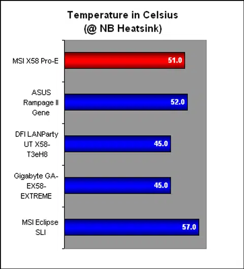 With a temperature reading at the chipset heatsink that broke the 50 degrees Celsius mark, the MSI board was quite a bit warmer than most of its competitors. The modest looking two-piece passive heatsinks may be a reason for its mediocre performance. It was however interesting to note that the other MSI X58 motherboard compared here, the Eclipse SLI, was also on the warm side.