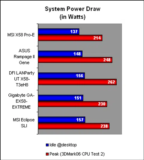 We enabled MSI's Green Power feature, setting it to Auto in the BIOS before the power consumption test. At both idle and peak, this MSI X58 Pro-E performed better than its peers, with quite a significant margin over the others for the power readings. MSI's active phase switching (APS) power scheme appeared to be working well.
