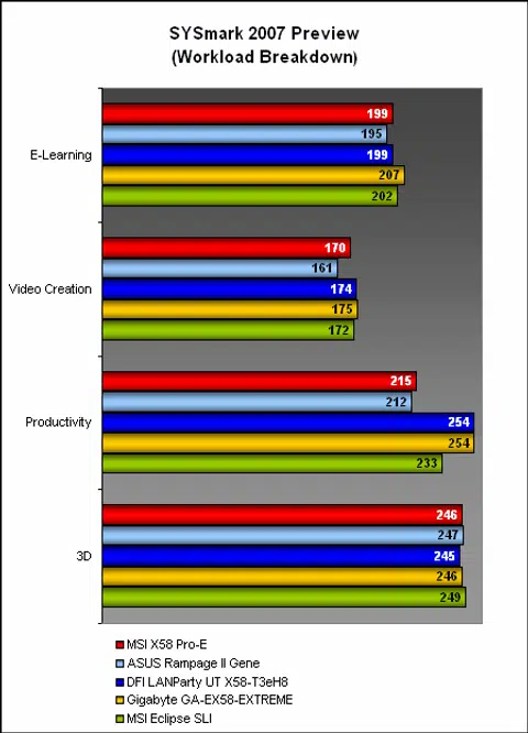 Compared to some of the higher end (read: more expensive) X58 motherboards here, the MSI X58 Pro-E had slightly lower scores. It did mange better than the ASUS Rampage II Gene, a mATX board. Breaking it down to the various segments, we noticed that the X58 Pro-E fell behind the others mostly in the Productivity segment. MSI's flagship Eclipse model also fell slightly behind its competitors in this segment. The ASUS mATX board too wasn't spared here.