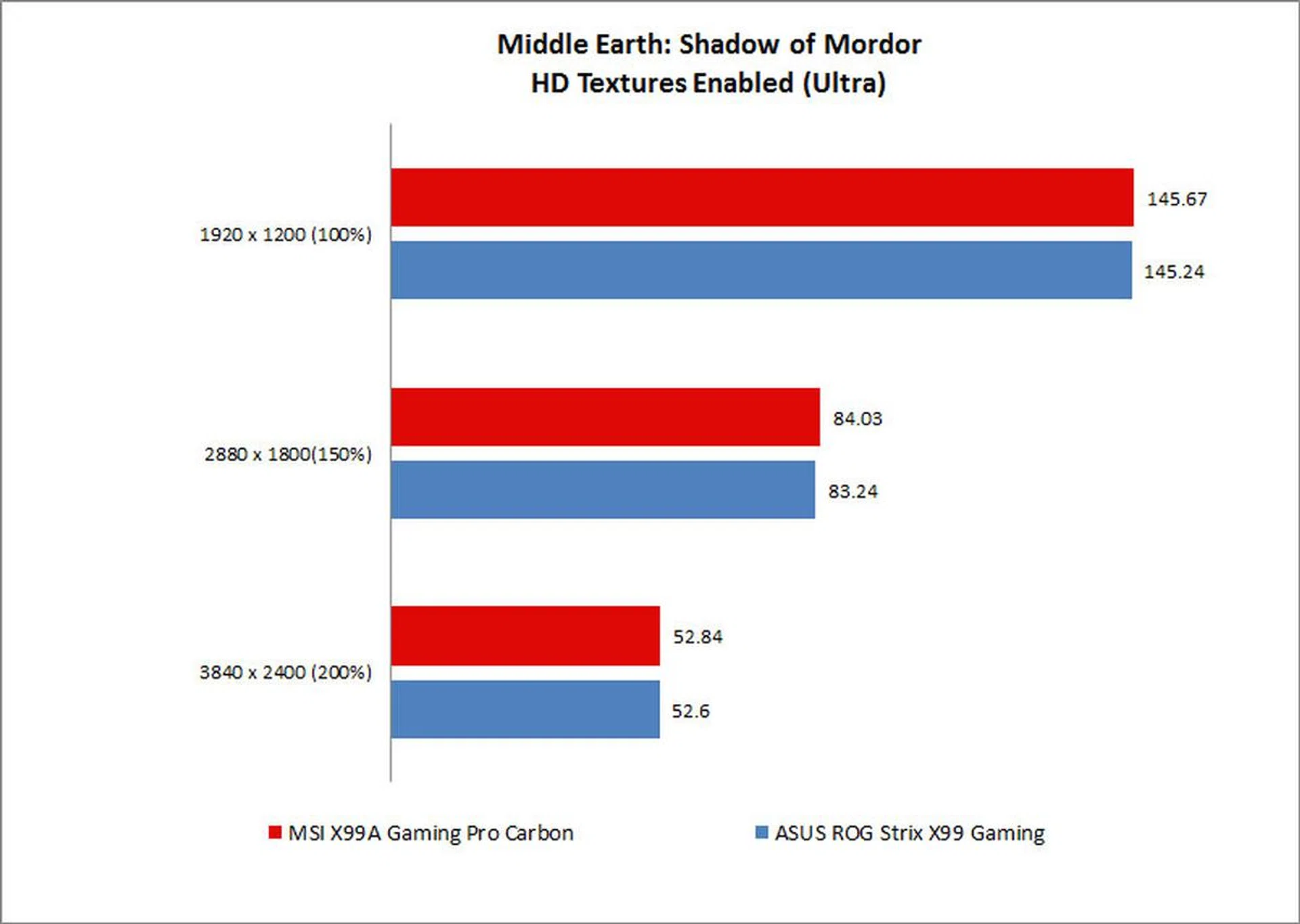 Finally, we ran Middle-earth: Shadow of Mordor to get an idea of real-world gaming performance. As per the graph, you can see that the performance gap was once again insignificant. In fact, they were remarkably consistent with each other, as both the ASUS and MSI board came within a single frame of each other at all the tested resolutions.
