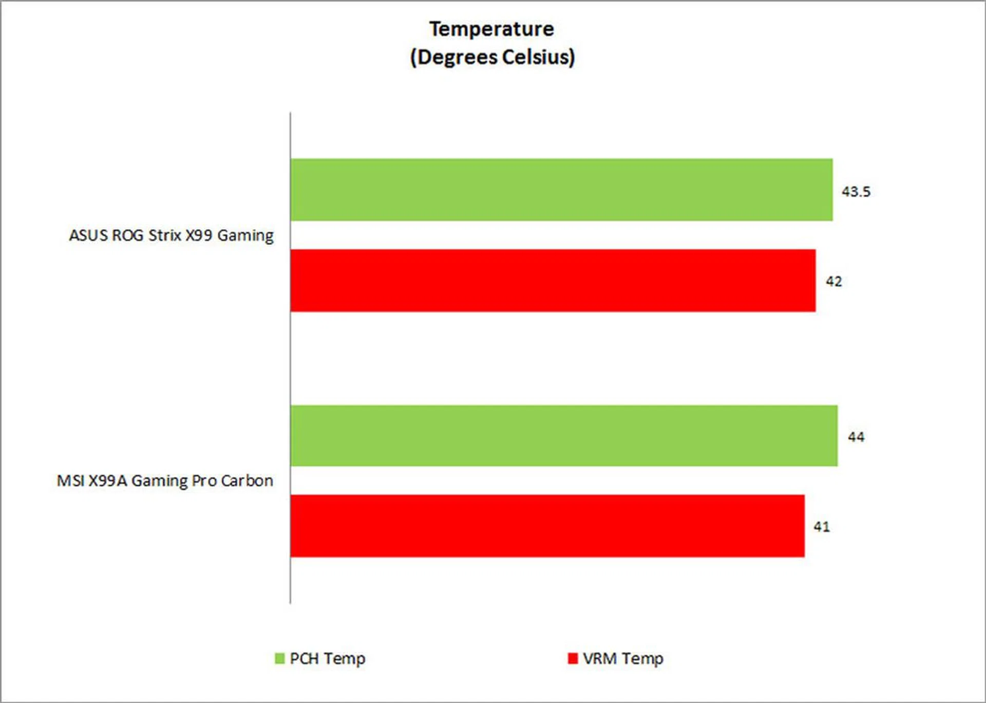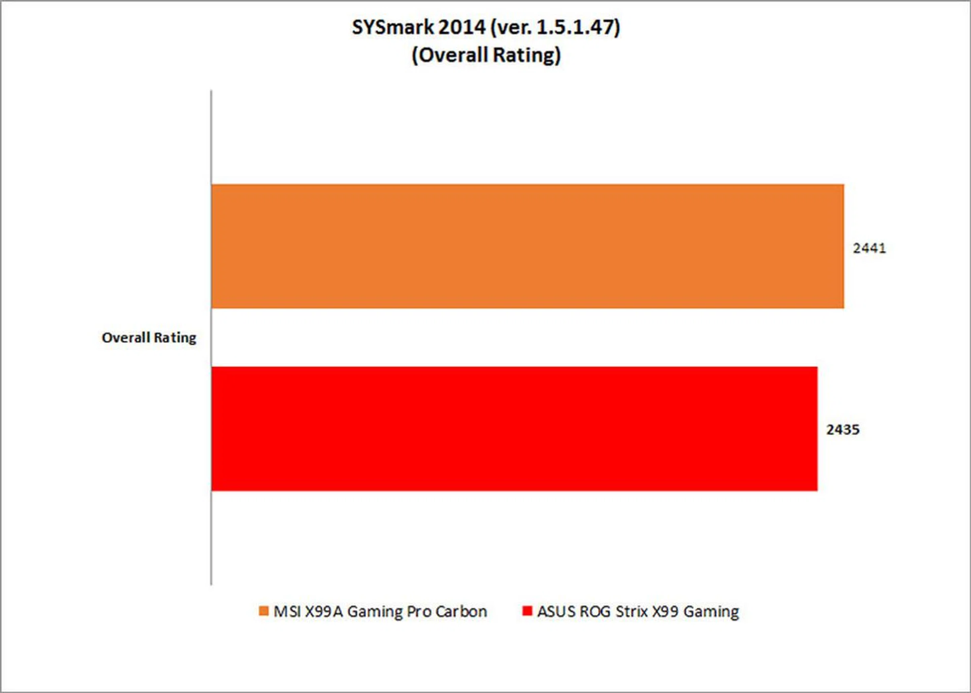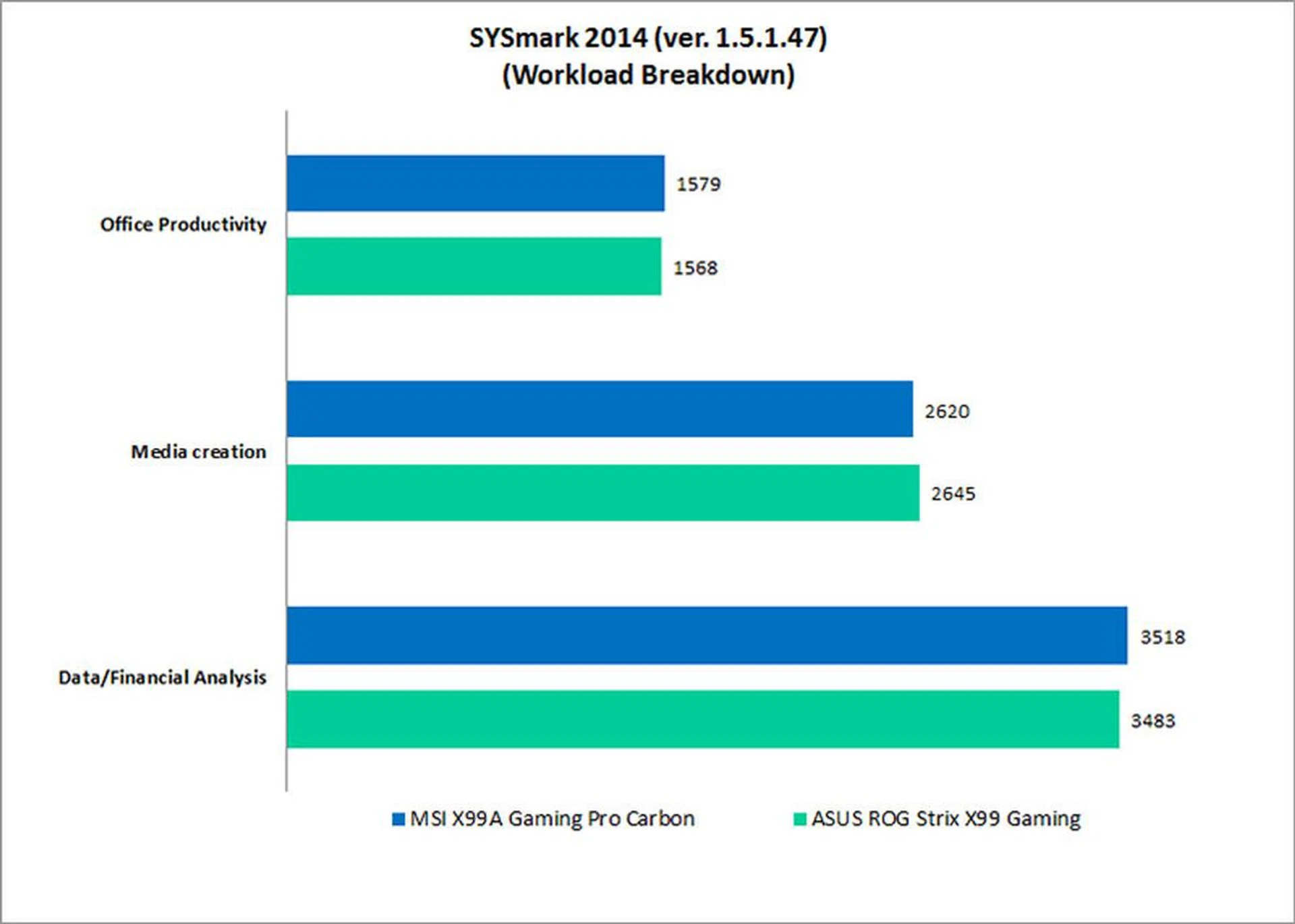 As we noted in our review of the ASUS ROG Strix X99 Gaming, we don’t have many Intel X99 motherboards to compare the board with, especially since we've chosen to use the new 10-core CPU, so we’ll use the latter board as a point of comparison for the MSI board.