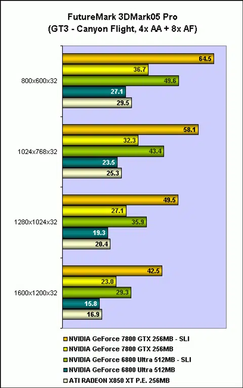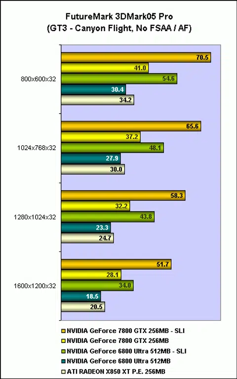 Taking a closer look at the frame rates of the three games that combine to generate the 3DMark05 result, it looks like the Canyon test has enough effects to bog down the graphics cards on the various resolutions, but the first two games seem to have hit a wall. Looks like we have to resort to overclocking the system if were to see any performance increase in those tests.