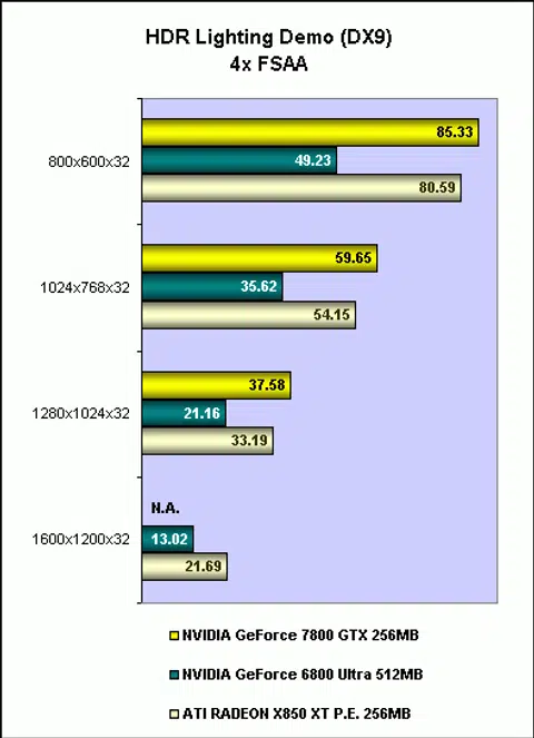 SLI test results was abysmally low in this high dynamic range lighting demo and was verified by NVIDIA too. For some reason, it couldn't activate the right SLI profile to get the desired results. That aside, we were still disappointed to see that the GeForce 7800 GTX was only marginally faster than the RADEON X850 XT P.E.