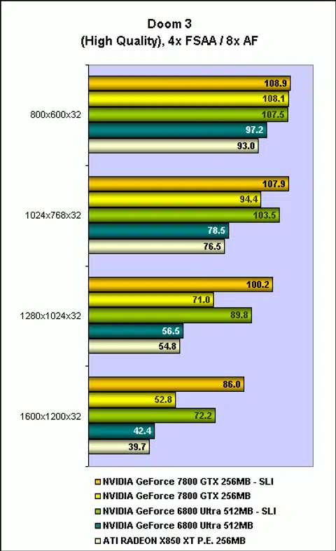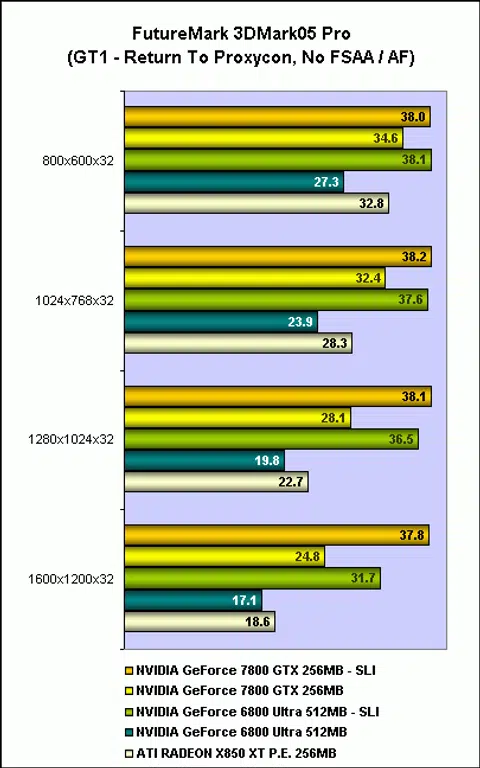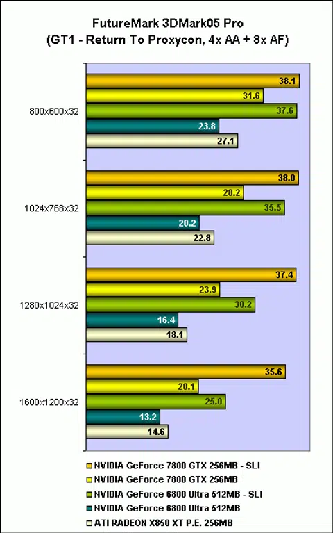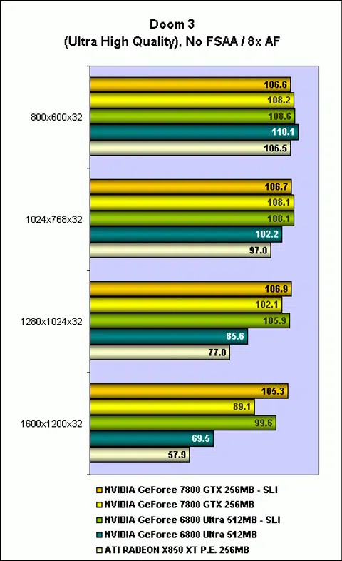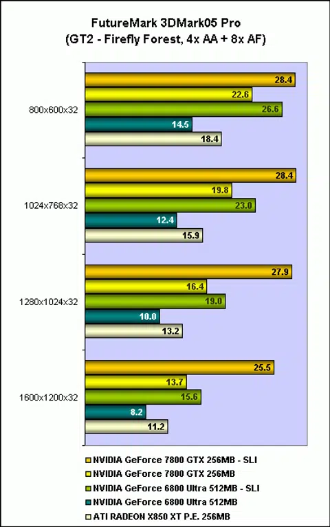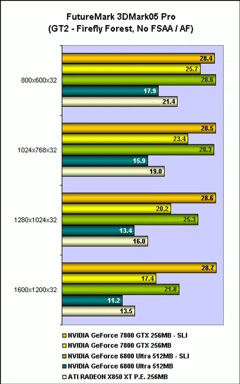 Here again the single graphics card performance improvements was a good 50% at the higher resolutions and just like in Halo, SLI wasn't too fantastic as the results indicate our CPU and system being the limiter than SLI's true throughput. Take note that we met problems with the ATI RADEON X850 XT P.E. in this benchmark, hence it's exclusion in this test.