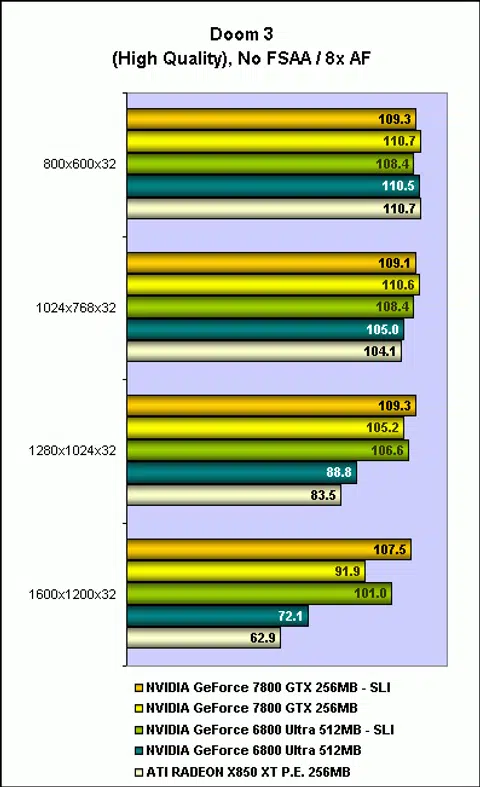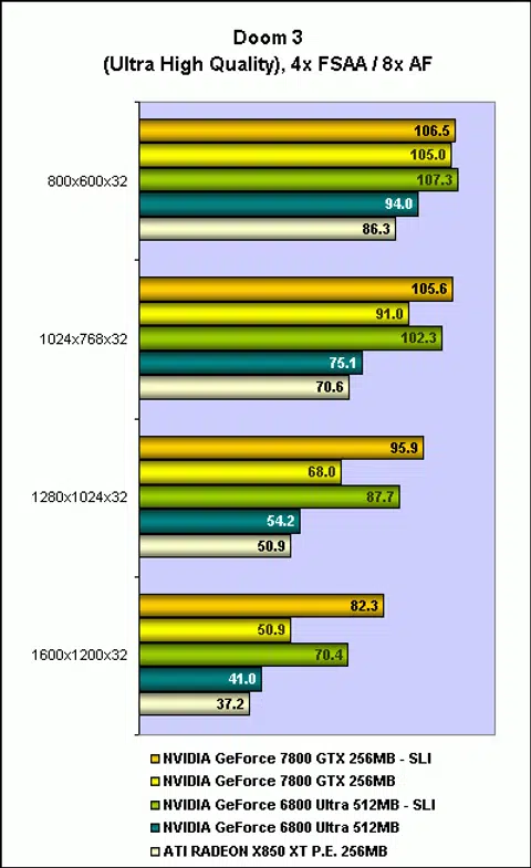 The performance gain in Doom 3 is nothing really spectacular either with the GeForce 7800 GTX at best averaging 25% better than its predecessor. SLI scales very well in this game and we finally see our prediction come true as the GeForce 7800 GTX SLI combo sped past the 80 frames per second mark at 1600 x 1200 with all image quality settings at maximum. Though our prediction in December 2004 was for the next generation graphics card to hit the 80FPS mark, the truth as it seems is just slightly off the mark, requiring a pair of next generation cards to achieve that feat. SLI did bring in massive performance gains, but it wasn't much more powerful than a pair of GeForce 6800 Ultra cards.