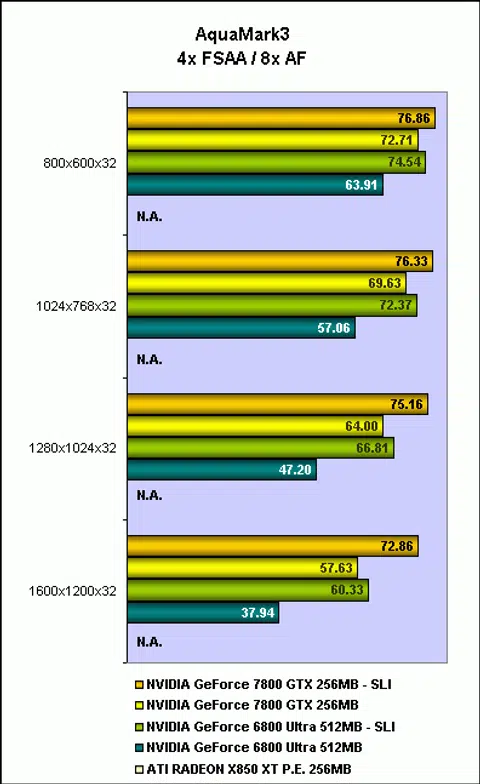 Extracting from the results below, we have the GeForce 7800 GTX powering ahead of the GeForce 6800 Ultra by 28% and comparing the respective SLI setups can also yield an equivalent advantage. The gap widens in favor of the GeForce 7800 GTX to about 40% when the workload increases with FSAA and AF. All these comparisons are made at a resolution of 1600x1200 since that's where the hardware is most taxed and given the high results obtained, it's likely what GeForce 7800 GTX owners would want to use.