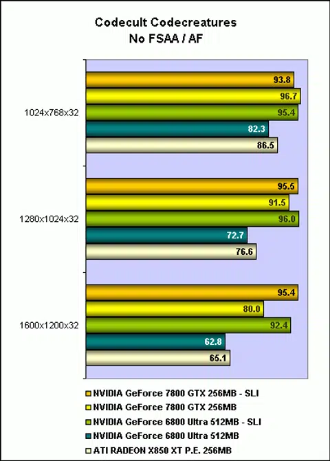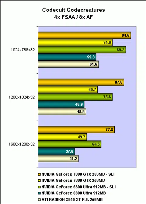 Using the Codecreatures demo, which is more of a very taxing DirectX 8, based engine, the lone GeForce 7800 GTX had a 30% lead ahead of the GeForce 6800 Ultra at 1600x1200 with 4x FSAA and 8x AF, but the equivalent SLI setup only had a 20% gain. It's sufficient to say that this is more of an outcome to consider when dealing with an older breed of games (albeit a demanding one) so the performance should not be tallied with those using a newer breed of game engines.
