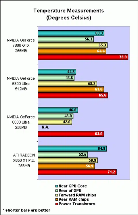 While NVIDIA managed to deliver the GeForce 7800 GTX in a single slot profile and maintained very low fan noise, heat was unfortunately rather high. The outcome plotted below is measured during intensive benchmarking and that's in our 22-degrees Celsius air-conditioned lab environment:-
