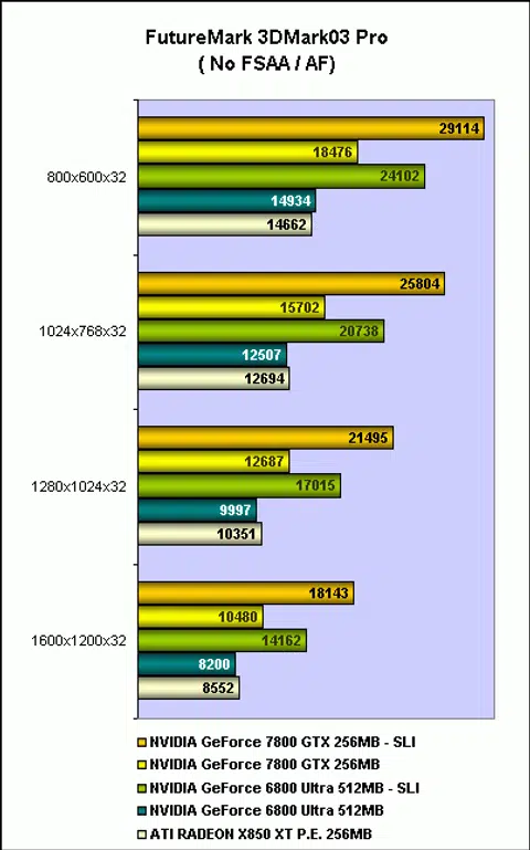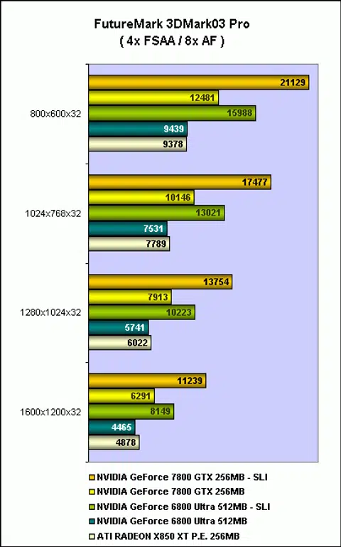 The situation with FSAA looks almost identical, as 3DMark05 doesn't show much of a hit, but SLI performance of the GeForce 7800 GTX has some good benefits. While the performance gain for single graphics cards is good comparing the GeForce 7800 GTX and the GeForce 6800 Ultra, the same cannot be said when you bring the RADEON X850 XT P.E. into the picture as the difference waters down to 'only' 30%.