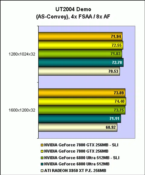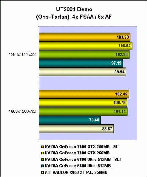 Unreal Tournament 2004 is a very platform and CPU limited game and it's not something to showcase the performance of a GeForce 78000 GTX. Nevertheless, we show you the outcome for those who are curious:-