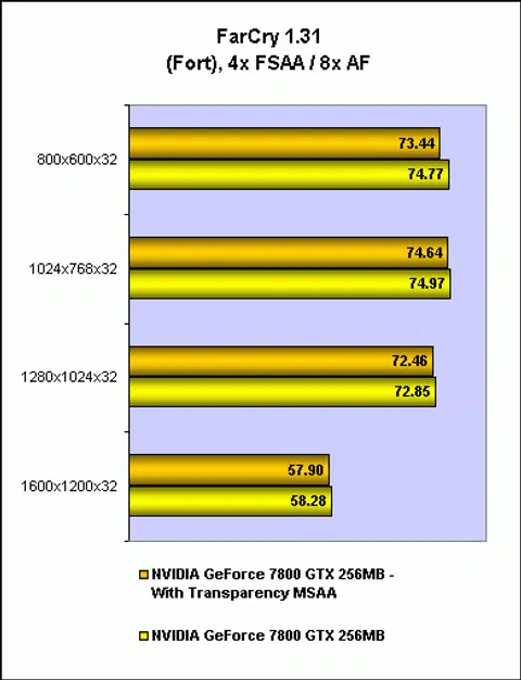 As for performance concerns with transparency antialiasing, we doubt it's going to eat much into a powerful card such as the GeForce 7800 GTX, but here's some results to reassure you:-