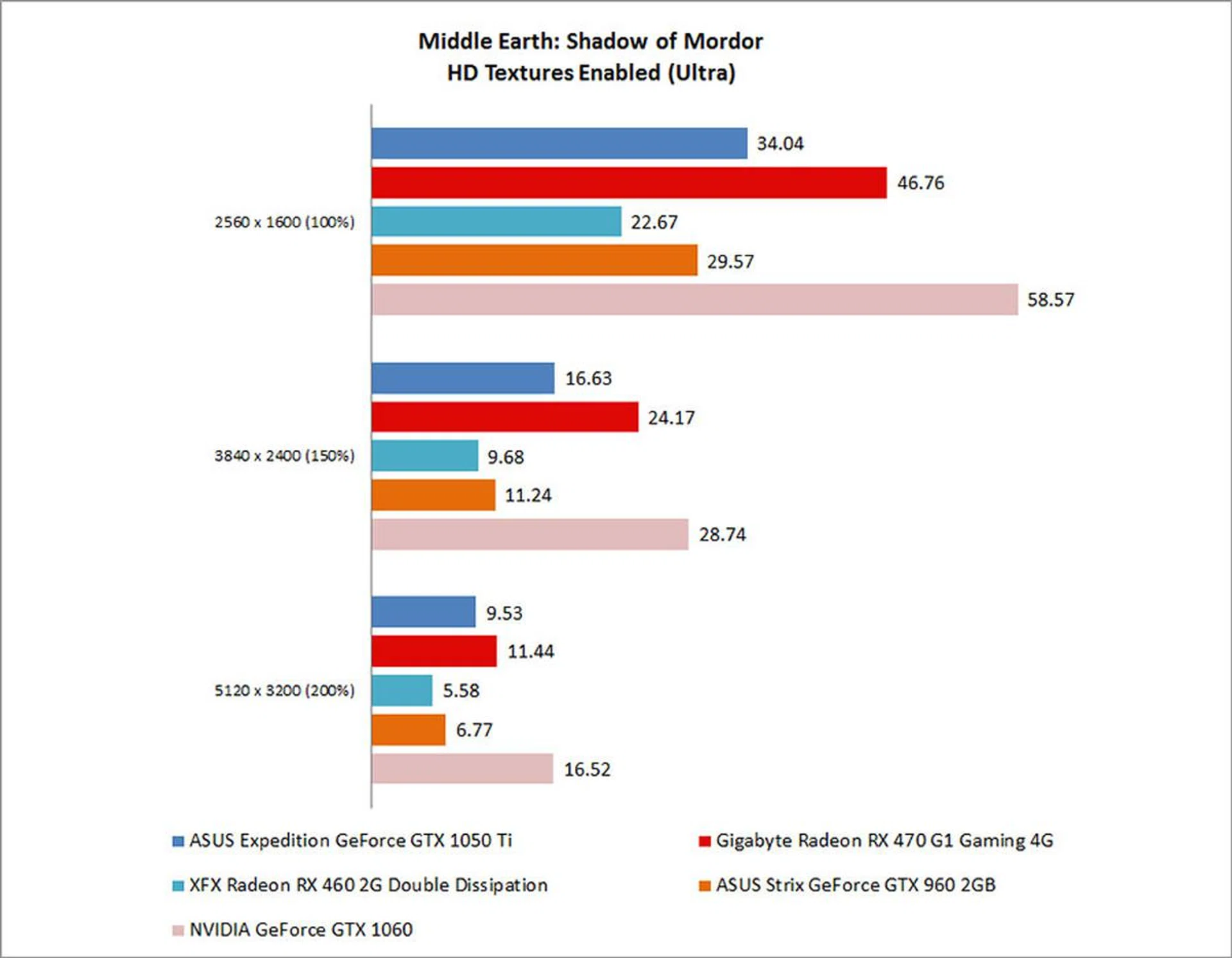 Because of the demanding resolutions that we run Shadow of Mordor at, this is a benchmark that is very much dependent on the memory bandwidth available. As a result, our 2GB version of the GeForce GTX 960 didn’t fare as well against the GeForce GTX 1050 Ti with 4GB of GDDR5 memory, where it ended up trailing by up to 13 per cent.