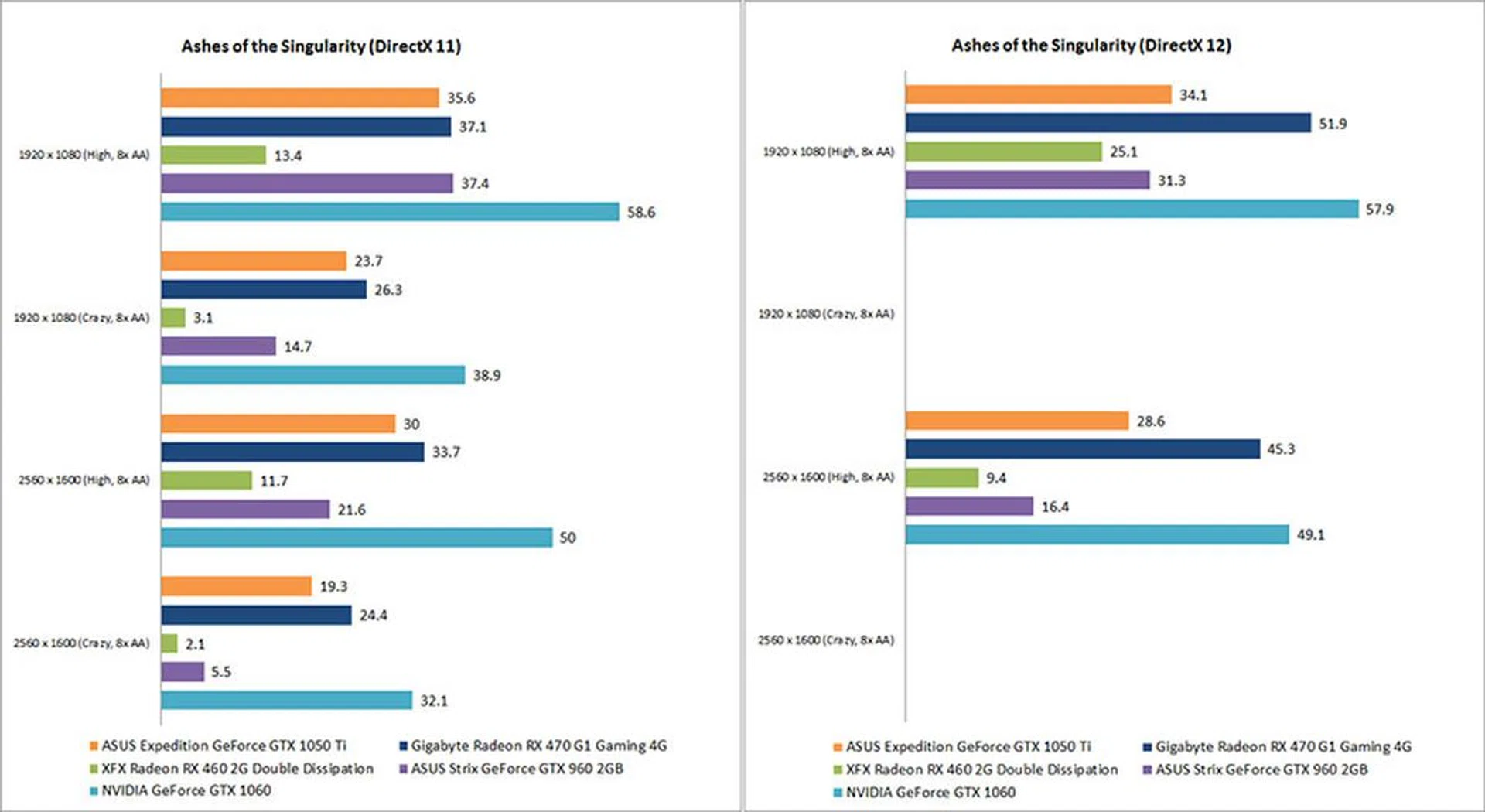 While AMD cards have traditionally excelled in Ashes of the Singularity (AotS) – indeed, the Radeon RX 470 posted as much as a 40 per cent improvement when moving to DirectX 12 – the Radeon RX 460 didn’t seem to be able to capitalize on any of that. Similarly, the GeForce GTX 1050 Ti exhibited similar performance numbers when moving over to DirectX 12. In fact, there was even a slight performance drop, which is disappointing but not unlike what we observed with the GeForce GTX 1060.