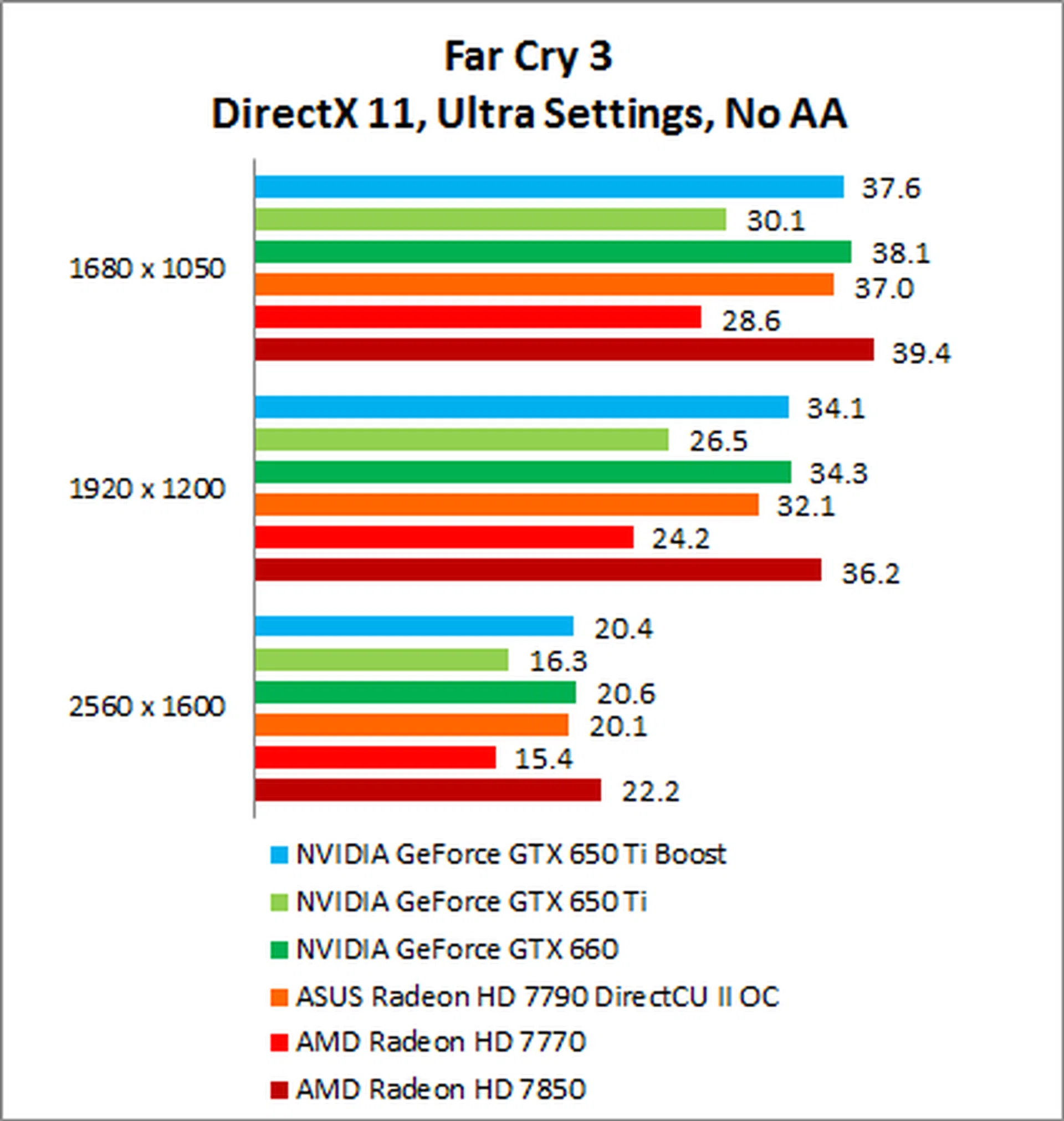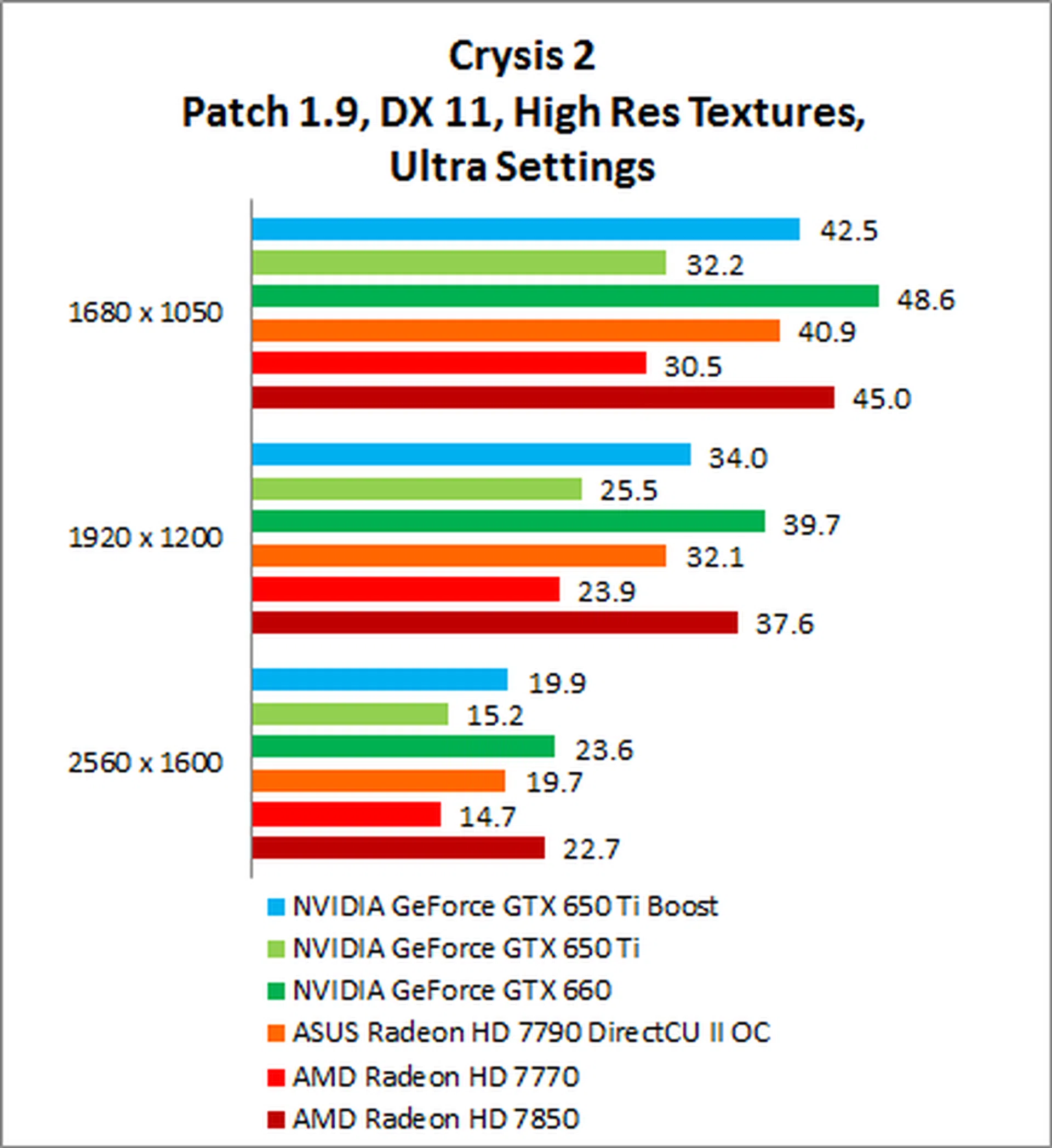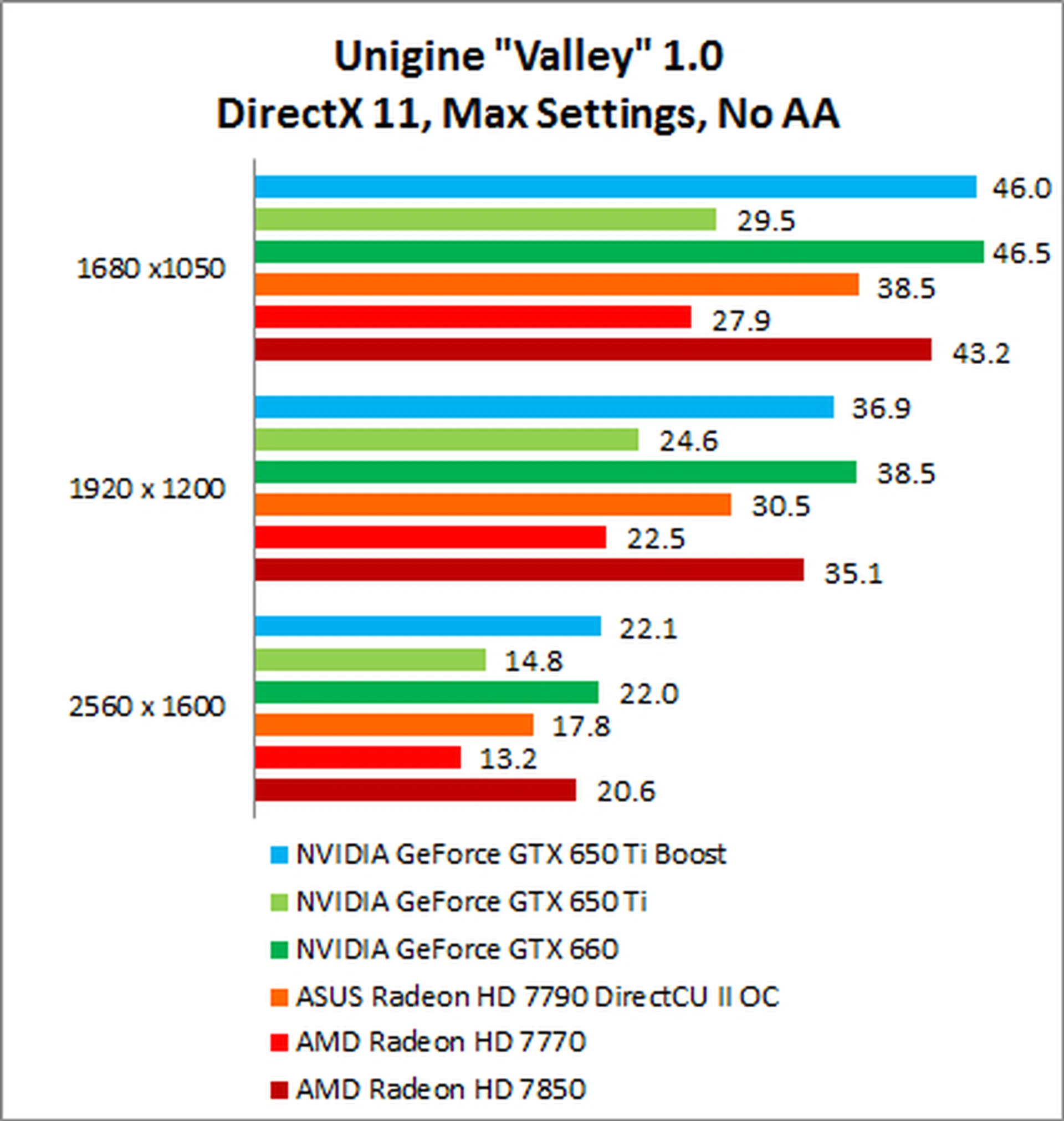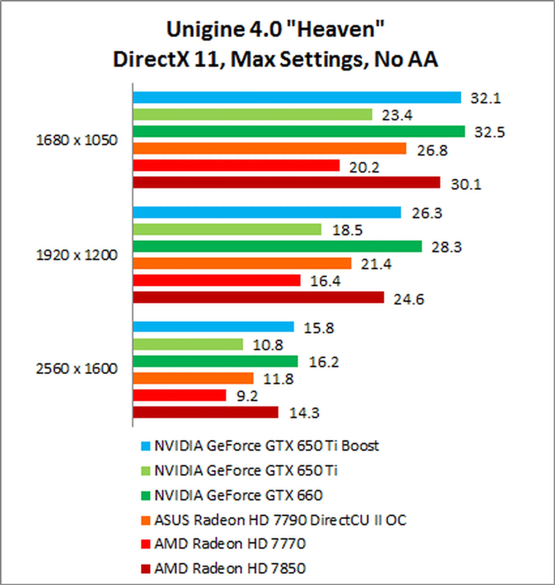 Against the HD 7790, the GTX 650 Ti Boost continued to outscore it by between 15% up to a massive 30% at the 2560 x 1600 resolution.