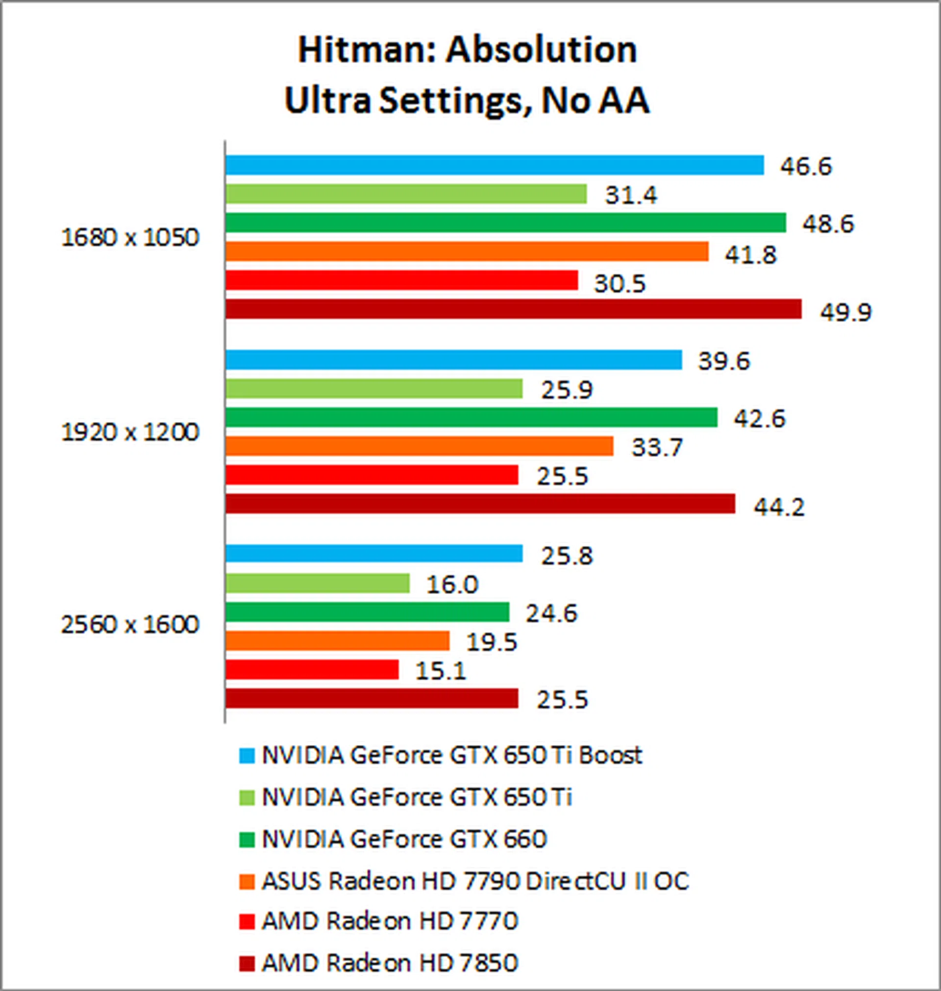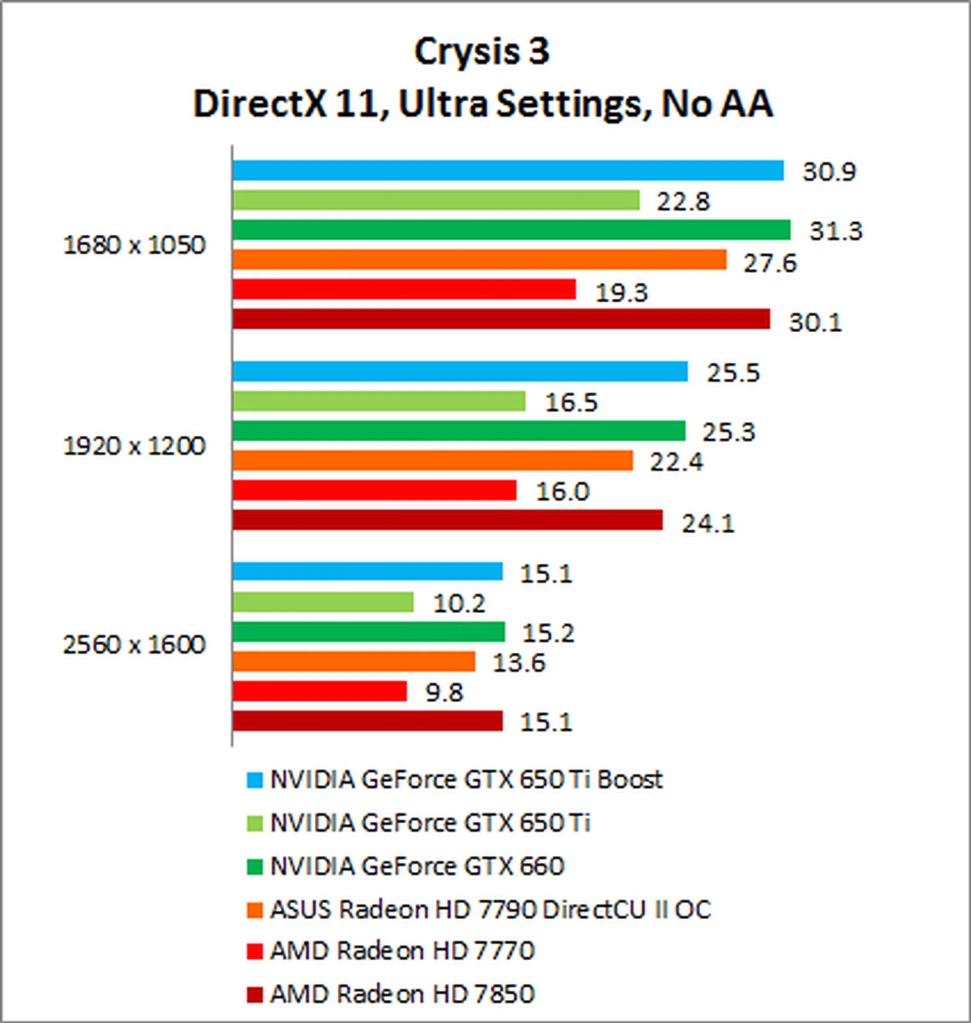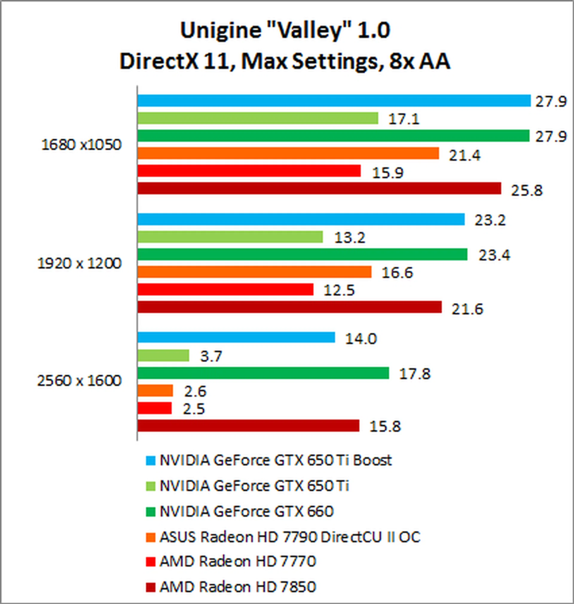 Against the HD 7790, the GTX 650 Ti Boost continued to outscore it by between 15% up to a massive 30% at the 2560 x 1600 resolution.