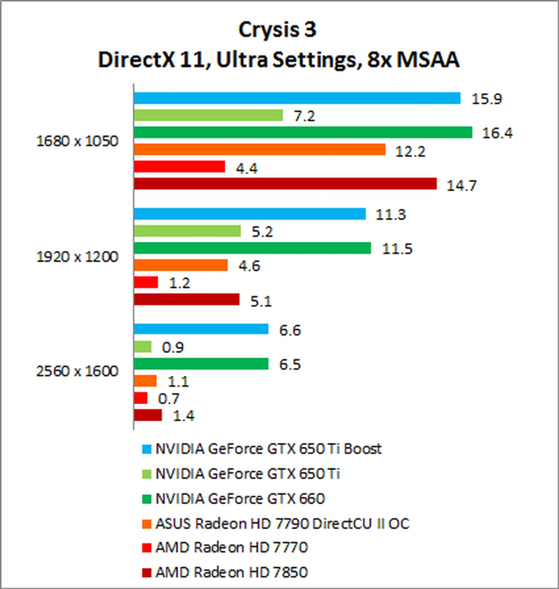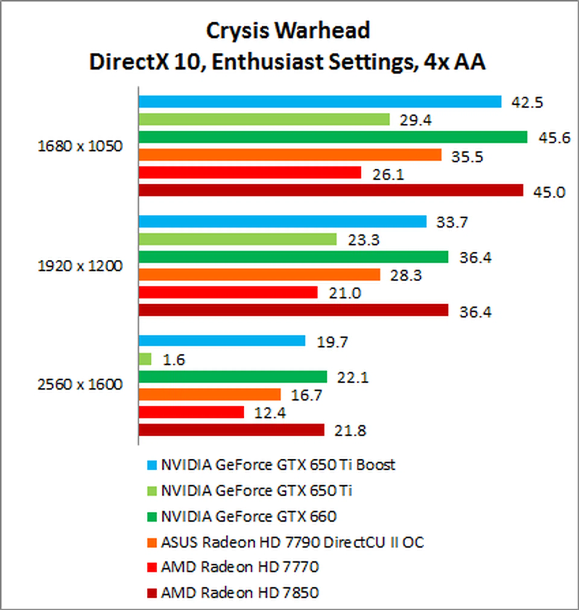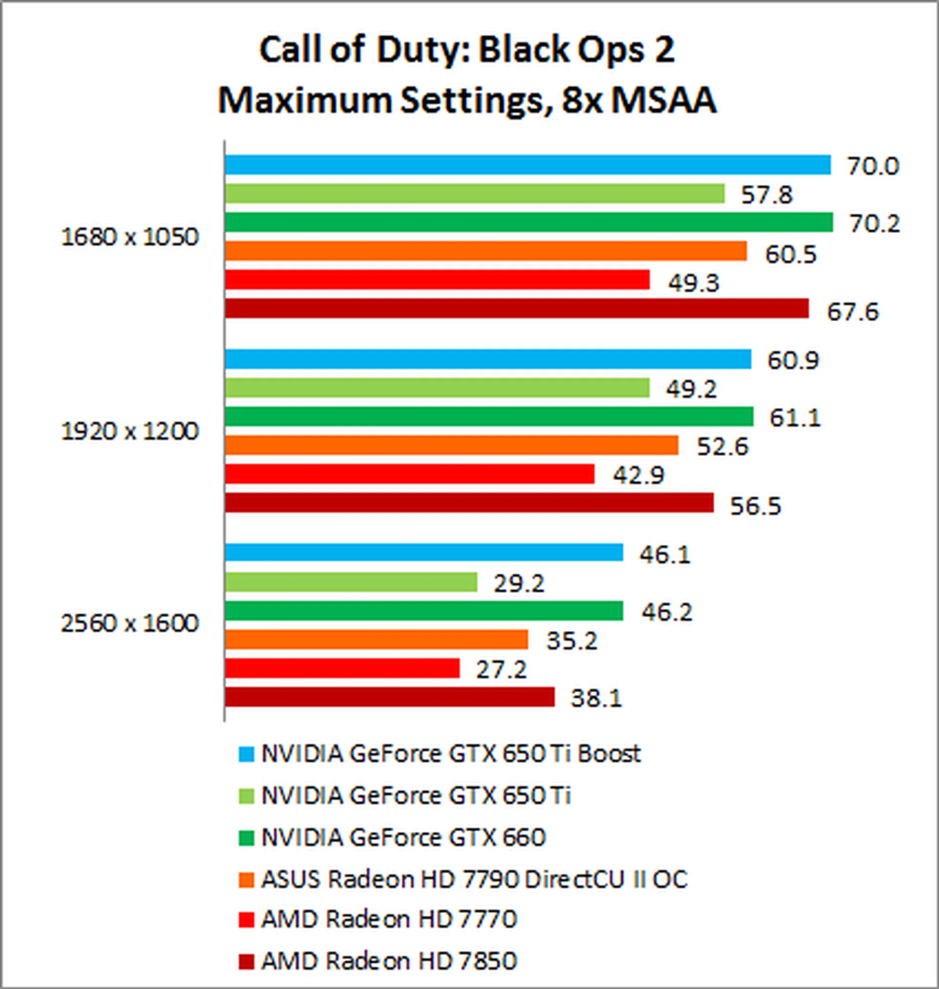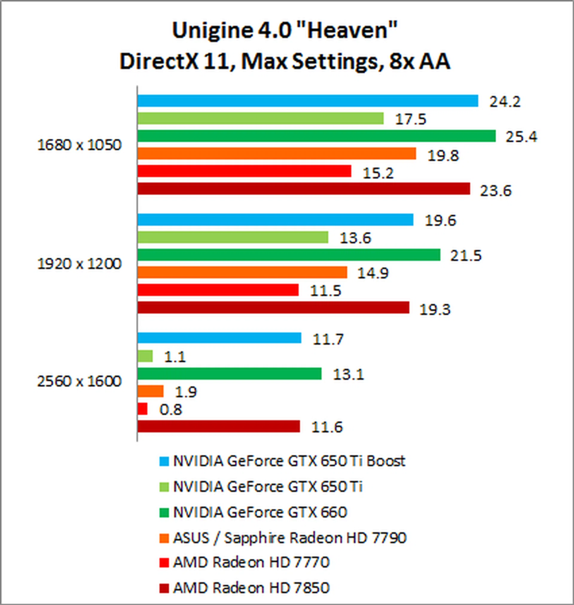 Against the HD 7790, the GTX 650 Ti Boost continued to outscore it by between 15% up to a massive 30% at the 2560 x 1600 resolution.