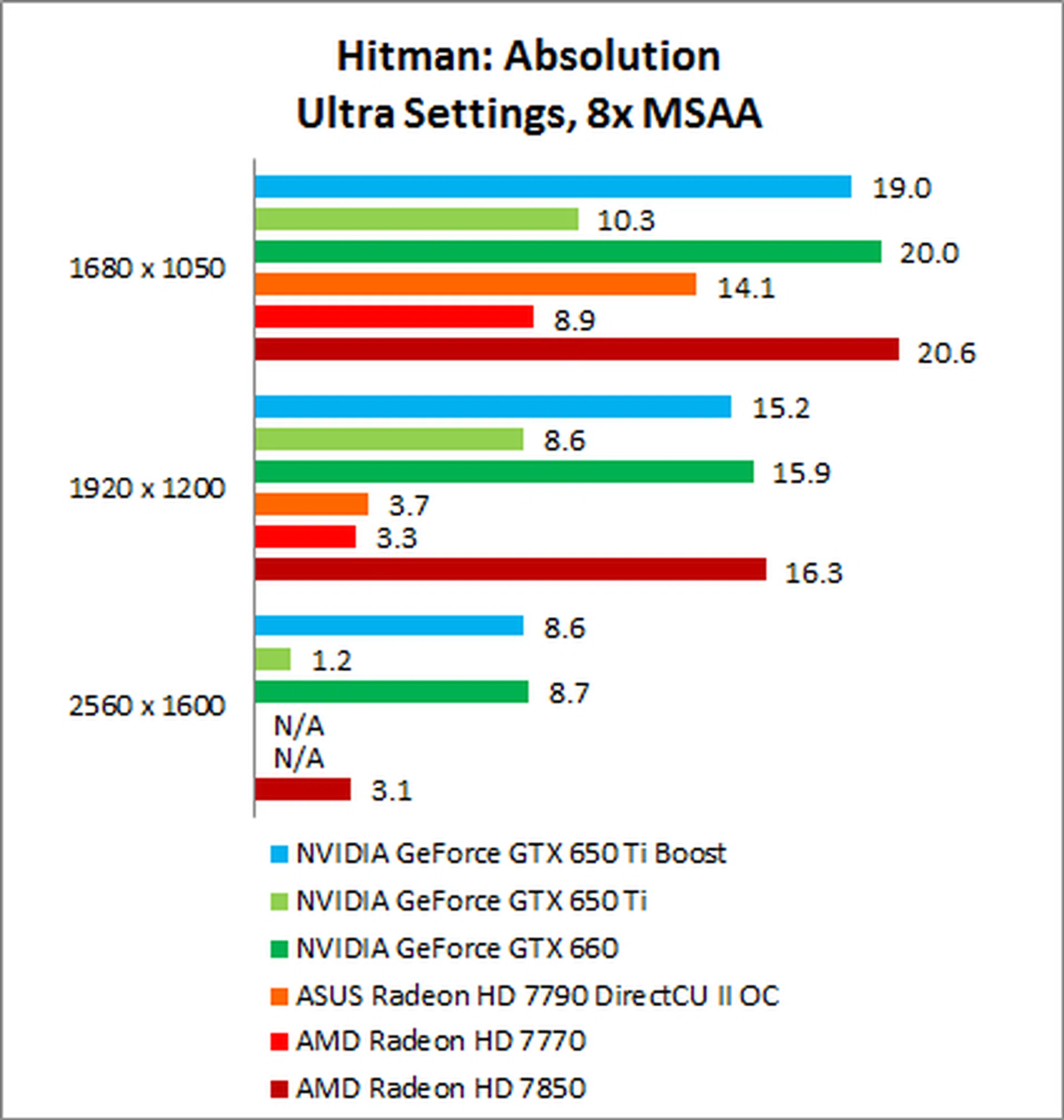 Hitman's benchmark is extremely taxing, especially at 8x MSAA, simply due to the sheer number of models that need to be anti-aliased. Having said that, the GTX 650 Ti Boost put in a solid performance, slightly trailing the GTX 660 at most resolutions, and even outscoring it at 2560 x 1600 resolution with AA turned off.
