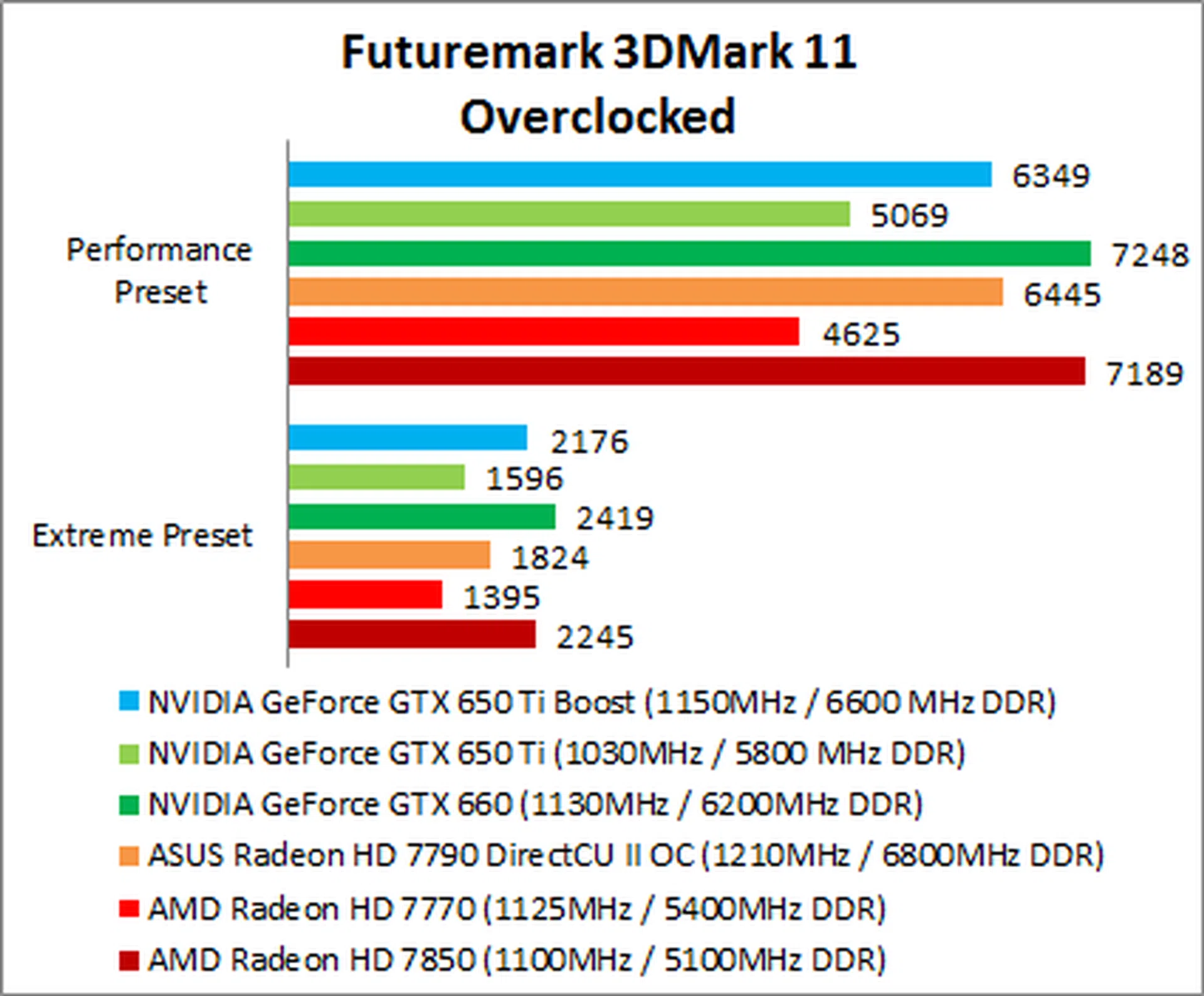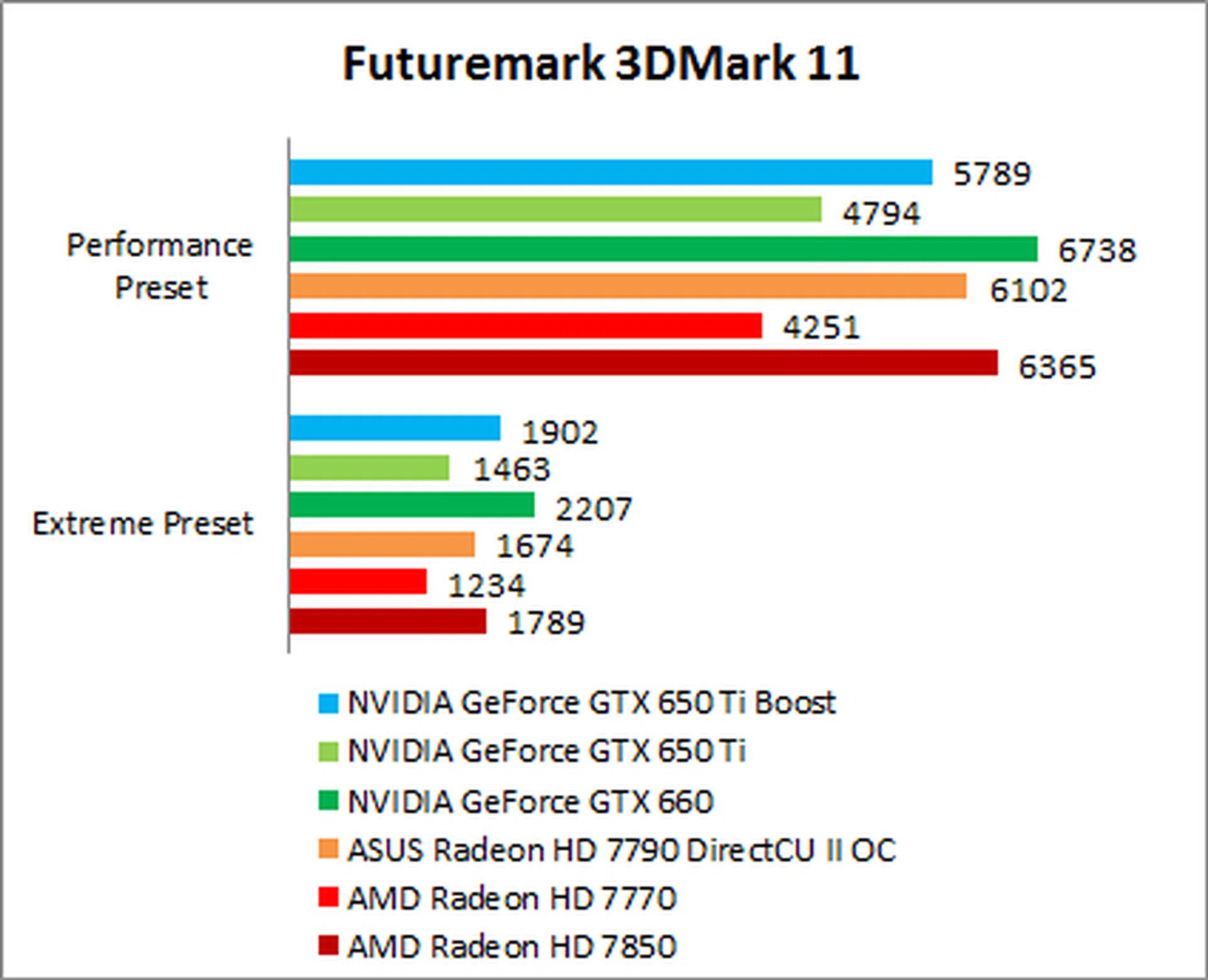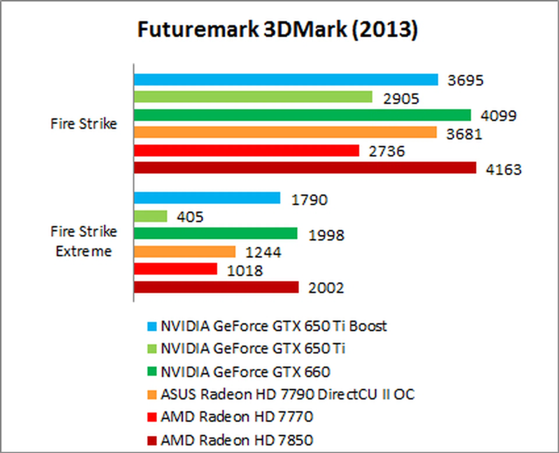 The GTX 650 Ti Boost was again impressive, vastly outscoring the GTX 650 Ti while trailing the GTX 660 by only 11% on both Fire Strike and Fire Strike Extreme.