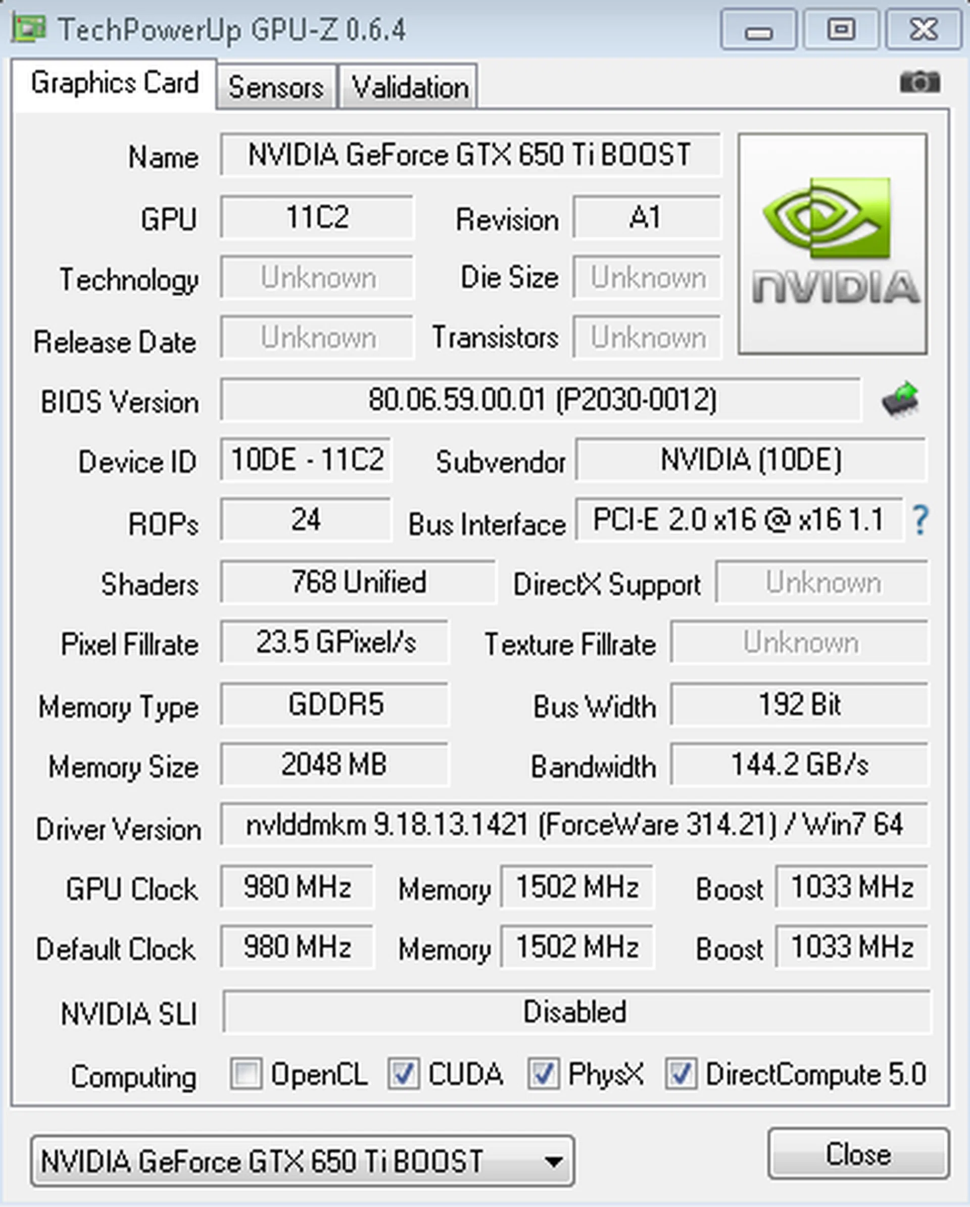 - NVIDIA GeForce GTX 650 Ti Boost 2GB GDDR5 (NVIDIA ForceWare 314.21 Beta)