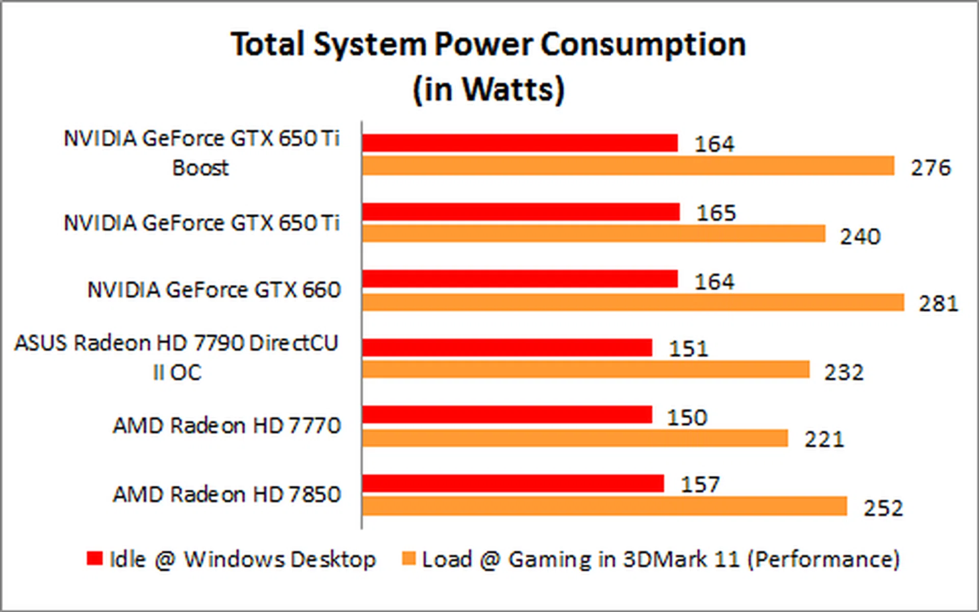 Power consumption was also much closer to the GTX 660 than the GTX 650 Ti, at just 5 Watts lower at load than the GTX 660. This was expected due to the way NVIDIA's GPU Boost always fully utilizes the available power threshold of the card.