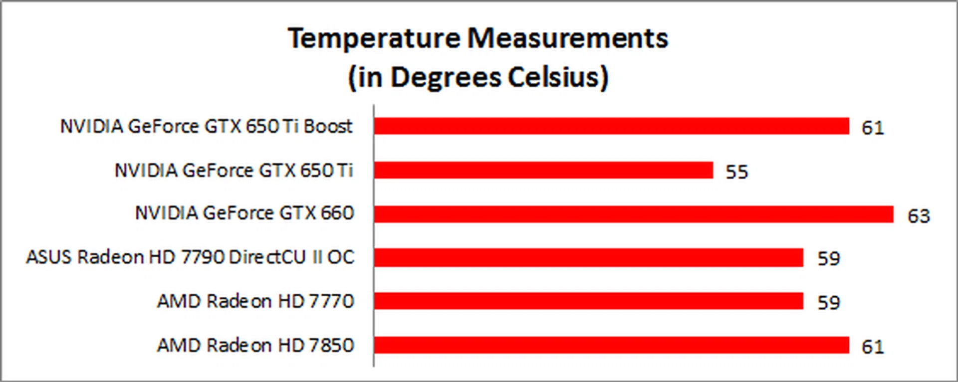 Similar to our performance benchmark results, the GTX 650 Ti Boost's temperature performance was much closer to that of the GTX 660.
