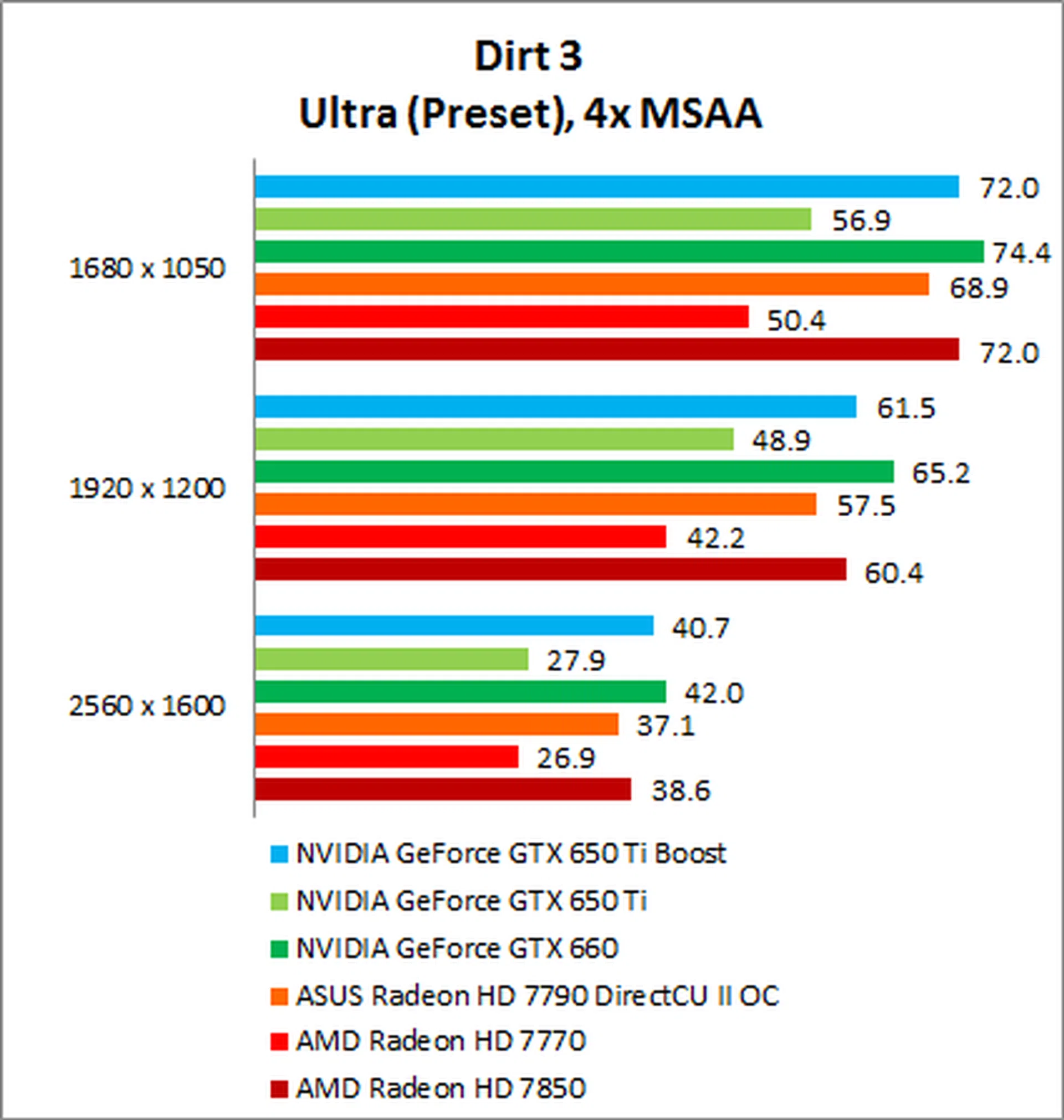 The GTX 650 Ti Boost performed better at Dirt 3, trailing the GTX 660 by about 3% while beating the HD 7790 by around 5-6% and the HD 7850 by around 1-2%.