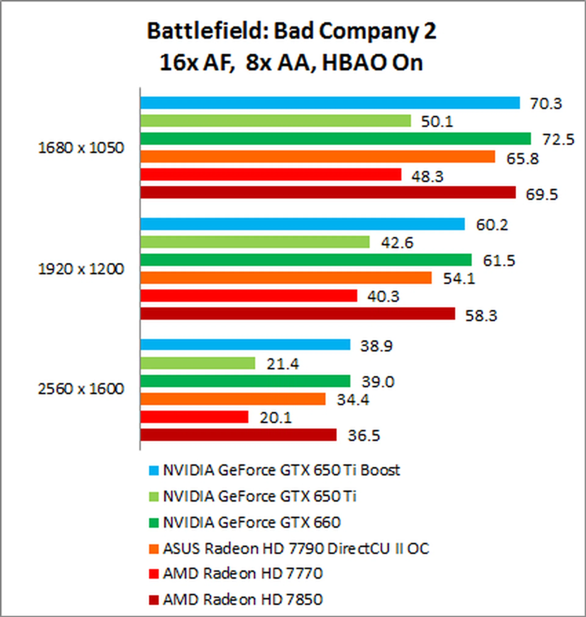 On Battlefield: Bad Company 2, the 650 Ti Boost again performed only slightly under the GTX 660, while outscoring the HD 7790 by around 6-10%.