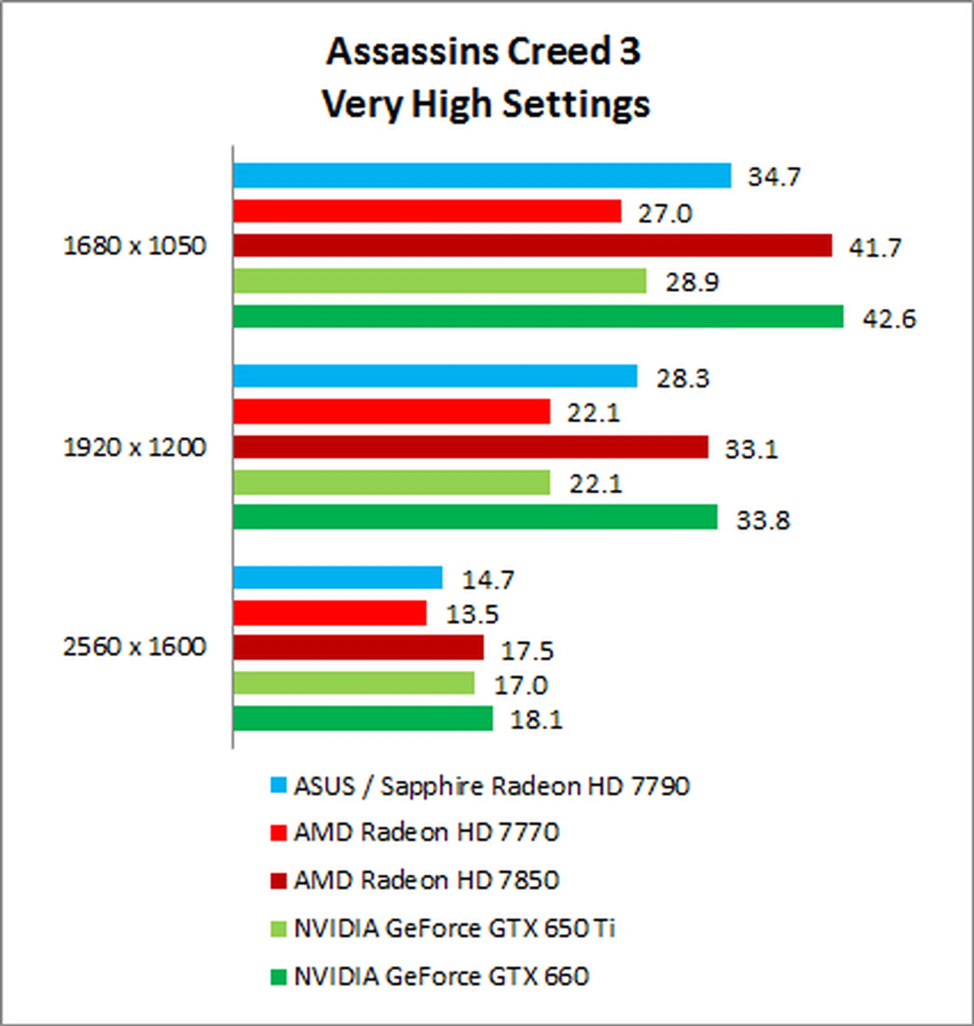 On Assassin's Creed 3, the GTX 650 Ti Boost again performed well, outscoring the HD 7790 by about 20% and trailing behind the GTX 660 by just 1 FPS across all resolutions.