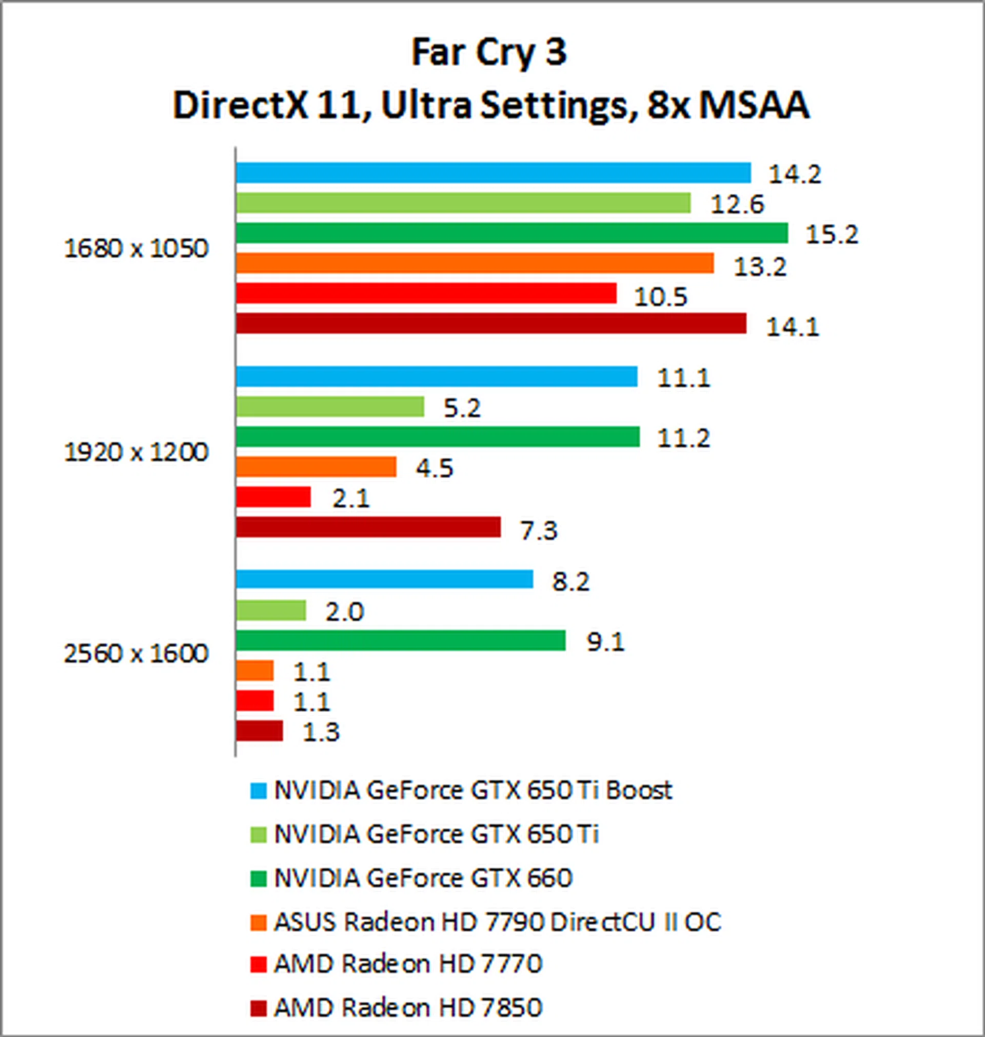 The GTX 650 Ti Boost performed fairly well on all settings and resolutions, scoring about halfway between the HD 7790 and GTX 660 - although all three cards dropped to unplayable framerates with MSAA set to 8x.