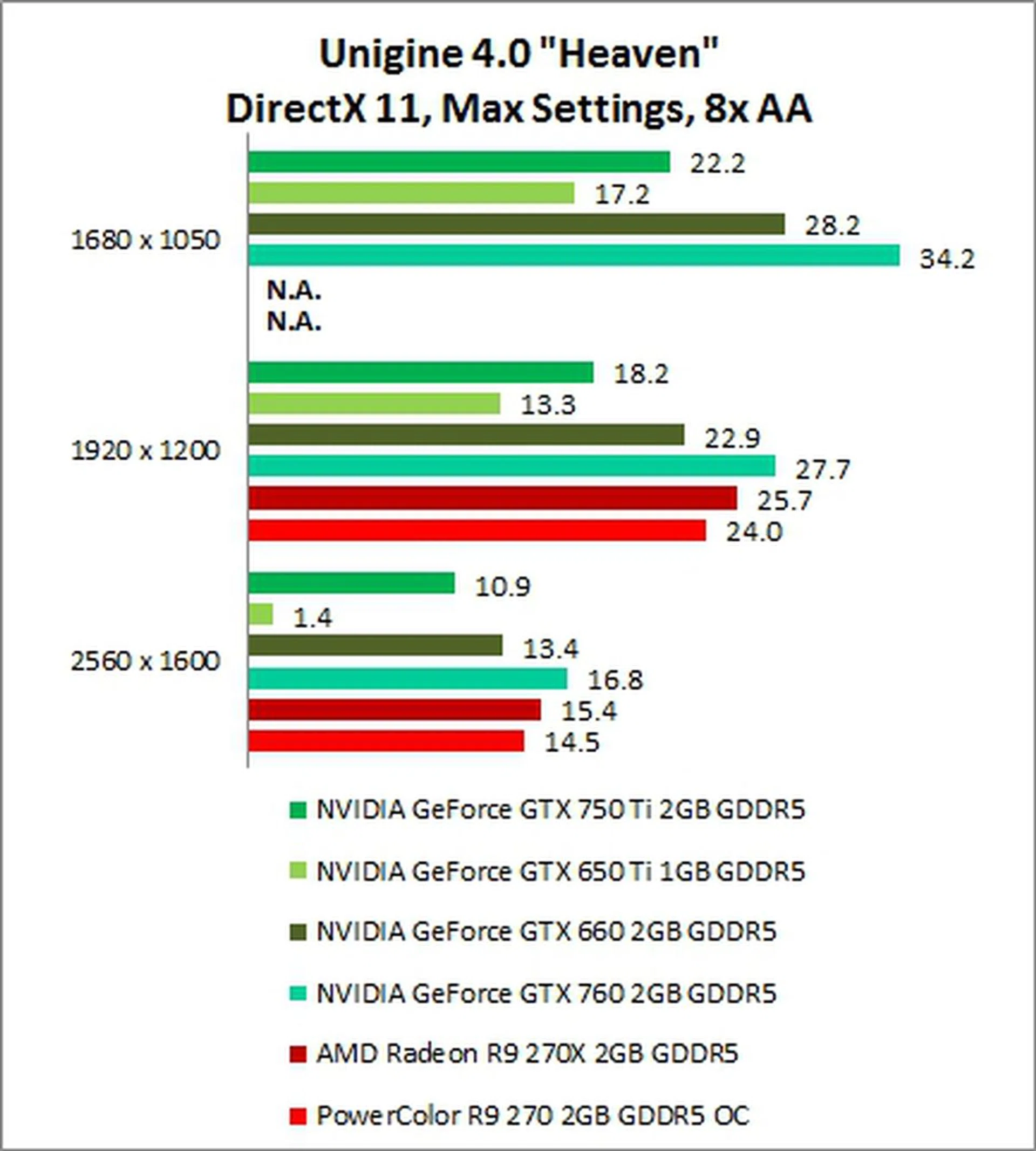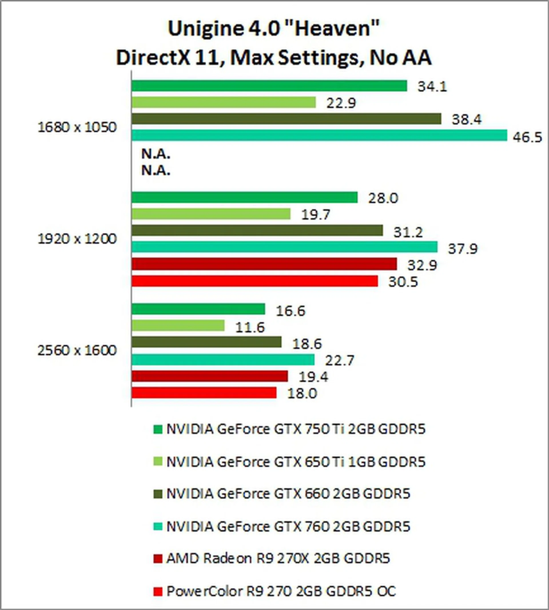 The Unigine 4.0 "Heaven" benchmark involves extreme amounts of tessellation and real-time global illumination to tax the GPU. The GPU is also tested with its dynamic sky with volumetric clouds, and screen-space ambient occlusion, among others. The new, first generation Maxwell chip continued to be outperformed by the other more recent generation graphics cards. However, the difference between the GTX 750 Ti and the Radeon R9 270 without antialiasing is minimal and that's heartening to note.
