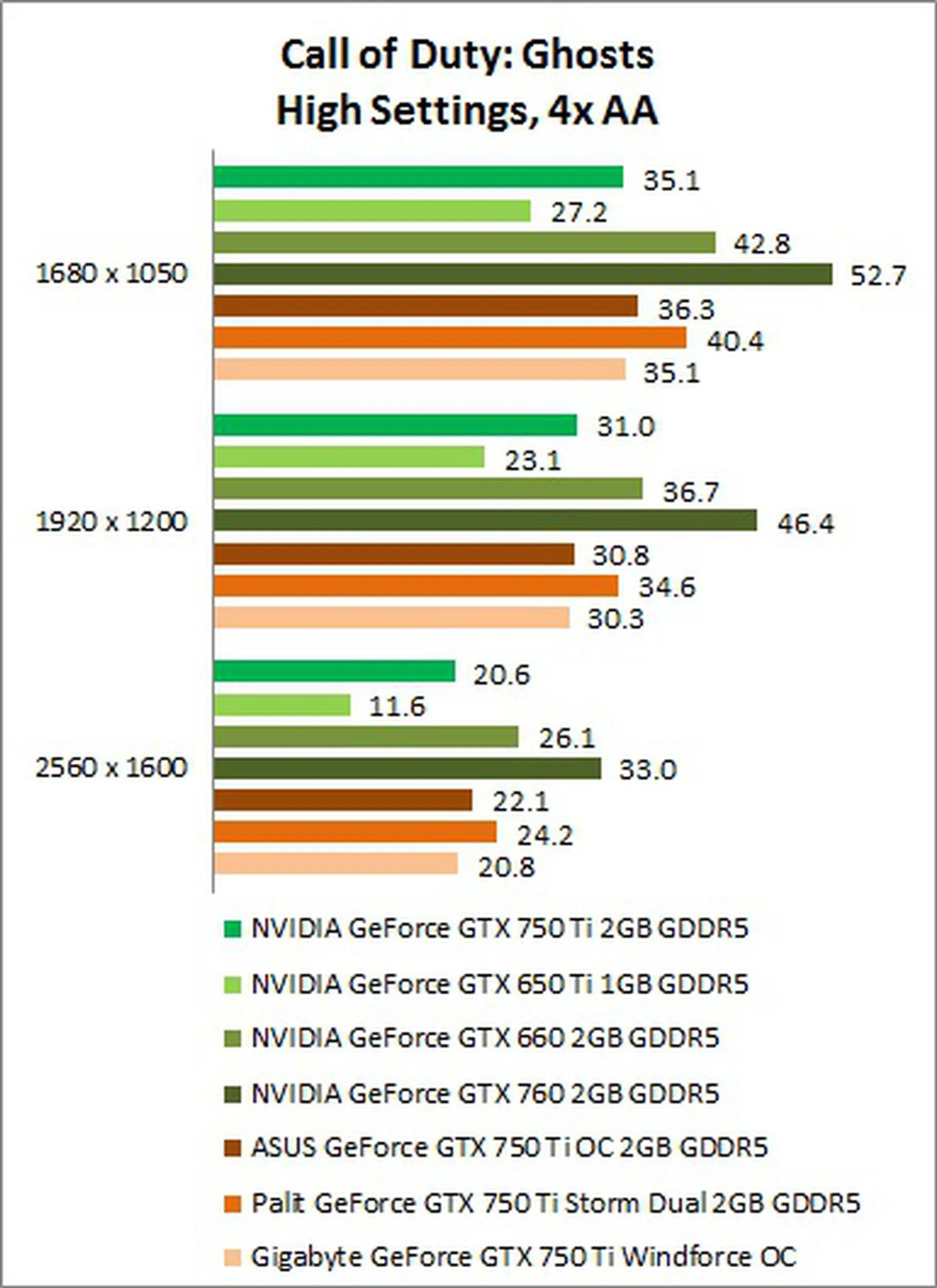 Our latest gaming benchmark, Call of Duty: Ghosts features the IW6 engine, which has been updated from the one that powered the Call of Duty: Modern Warfare 3. According to NVIDIA, the game features the company's exclusive technologies like TXAA anti-aliasing, 3D Vision, SLI and PhysX. The game is developed by Infinity Ward and published by Activision Publishing. For this quick preview test, we set most of the game's settings to high levels; while keeping the anti-aliasing to 4x. With the add-in partners' cards, we had a better sense of the performance of the NVIDIA GeForce GTX 750 Ti. Generally speaking, gaming experience with the new, first generation Maxwell chip is best kept at a resolution of 1680 x 1050 pixels, with anti-aliasing set at four times. If you can forego anti-aliasing or settle for mid-level image quality, full HD gameplay is again achievable.