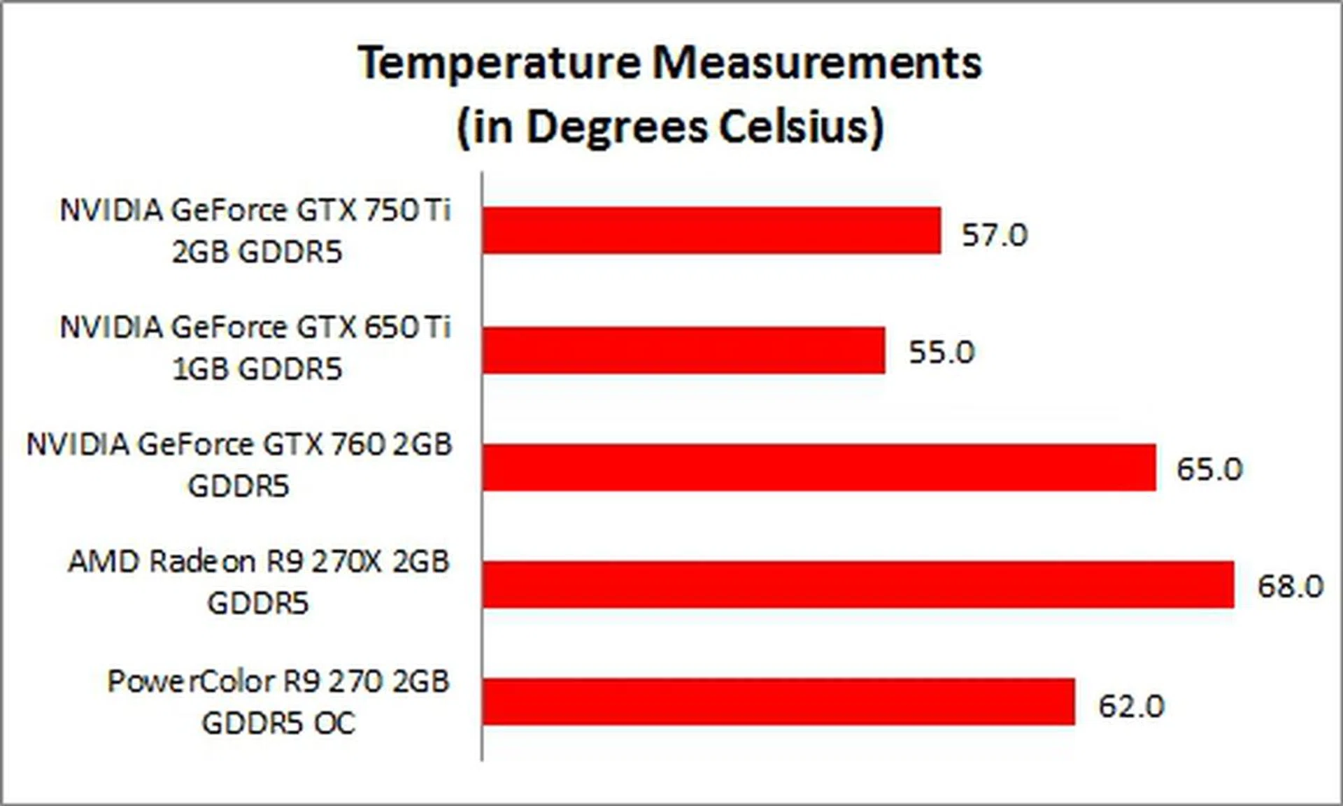 The core temperature of the GeForce GTX 750 Ti was naturally the lowest at 57 degrees Celsius. It also helped that the rated thermal design power of the GTX 750 Ti is only 60W. The threshold temperature of the new Maxwell chip is 95 degrees Celsius; hence, with its support for GPU Boost 2.0, we do expect to see the custom cooling system of add-in card partners come into play, to keep the GM107 core running cooler yet so that the GPU can boost its performance levels accordingly.