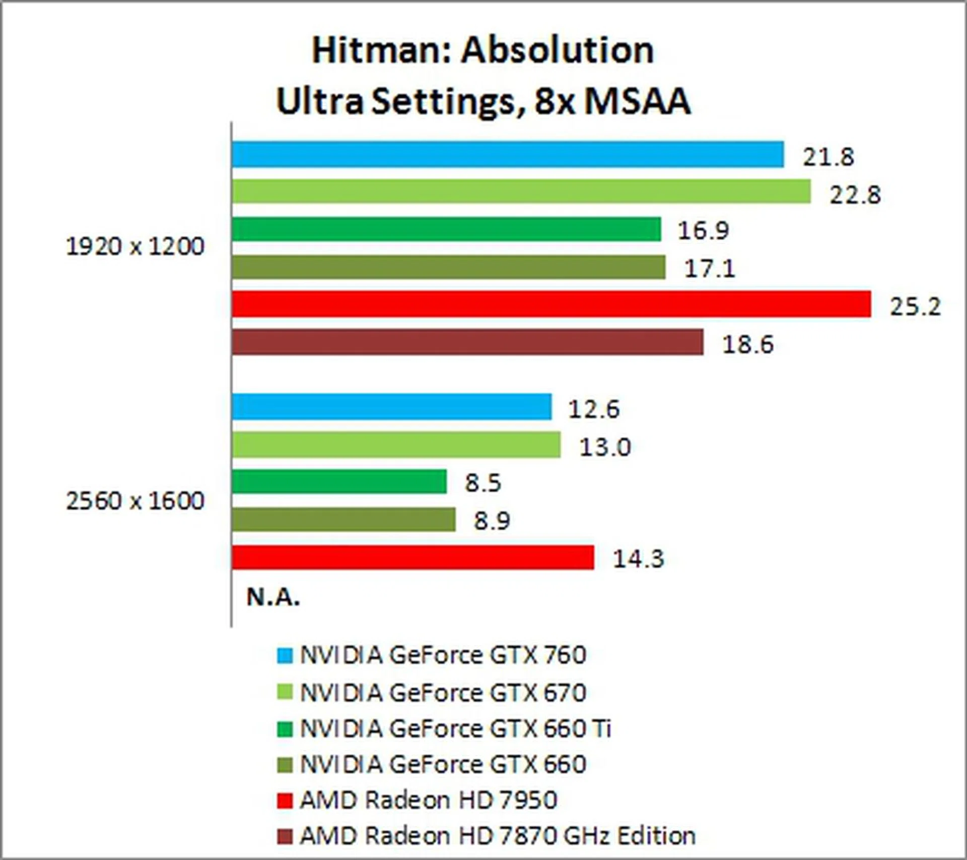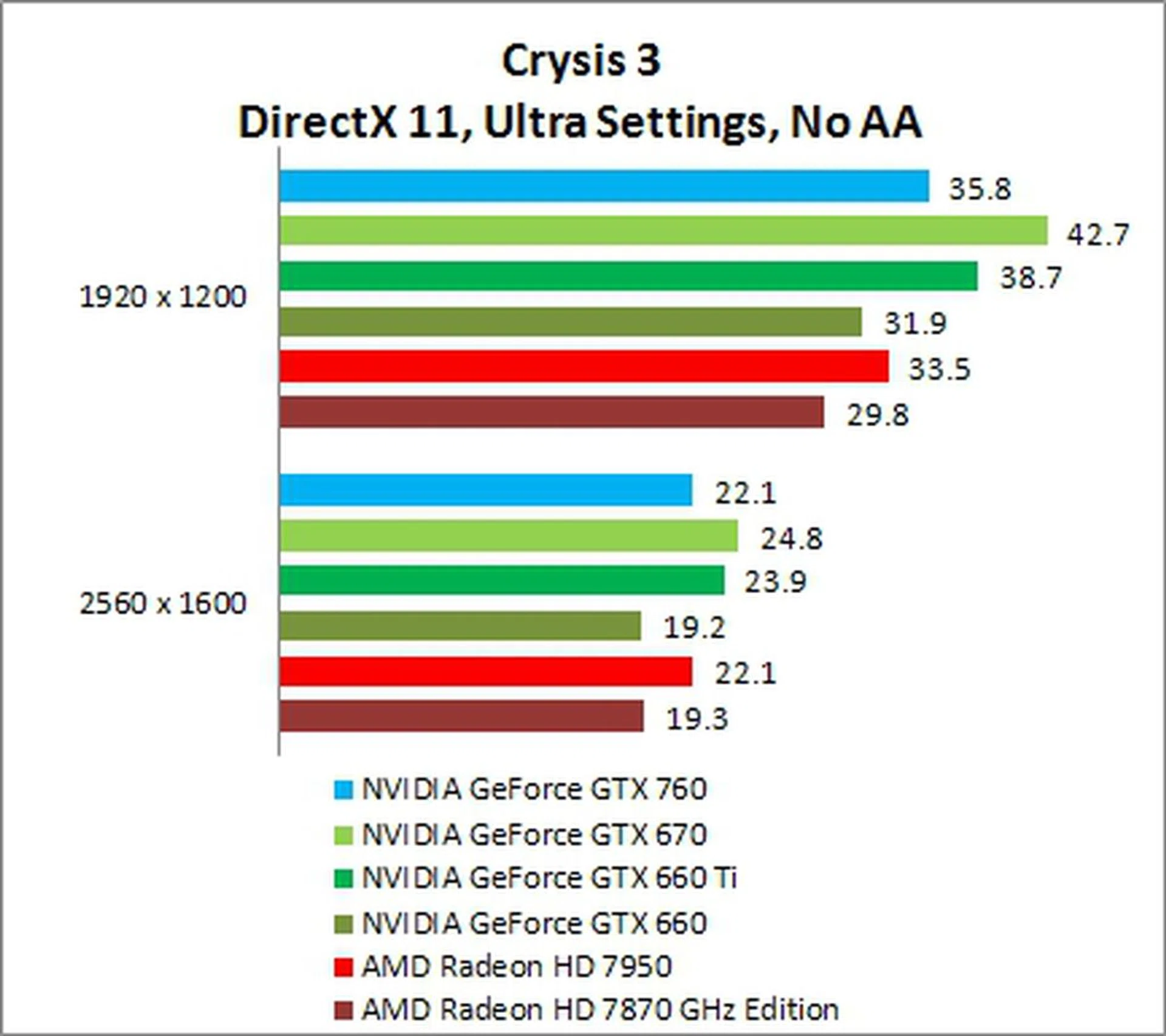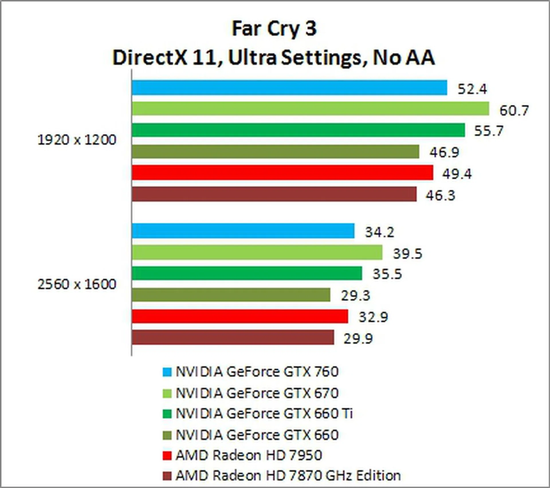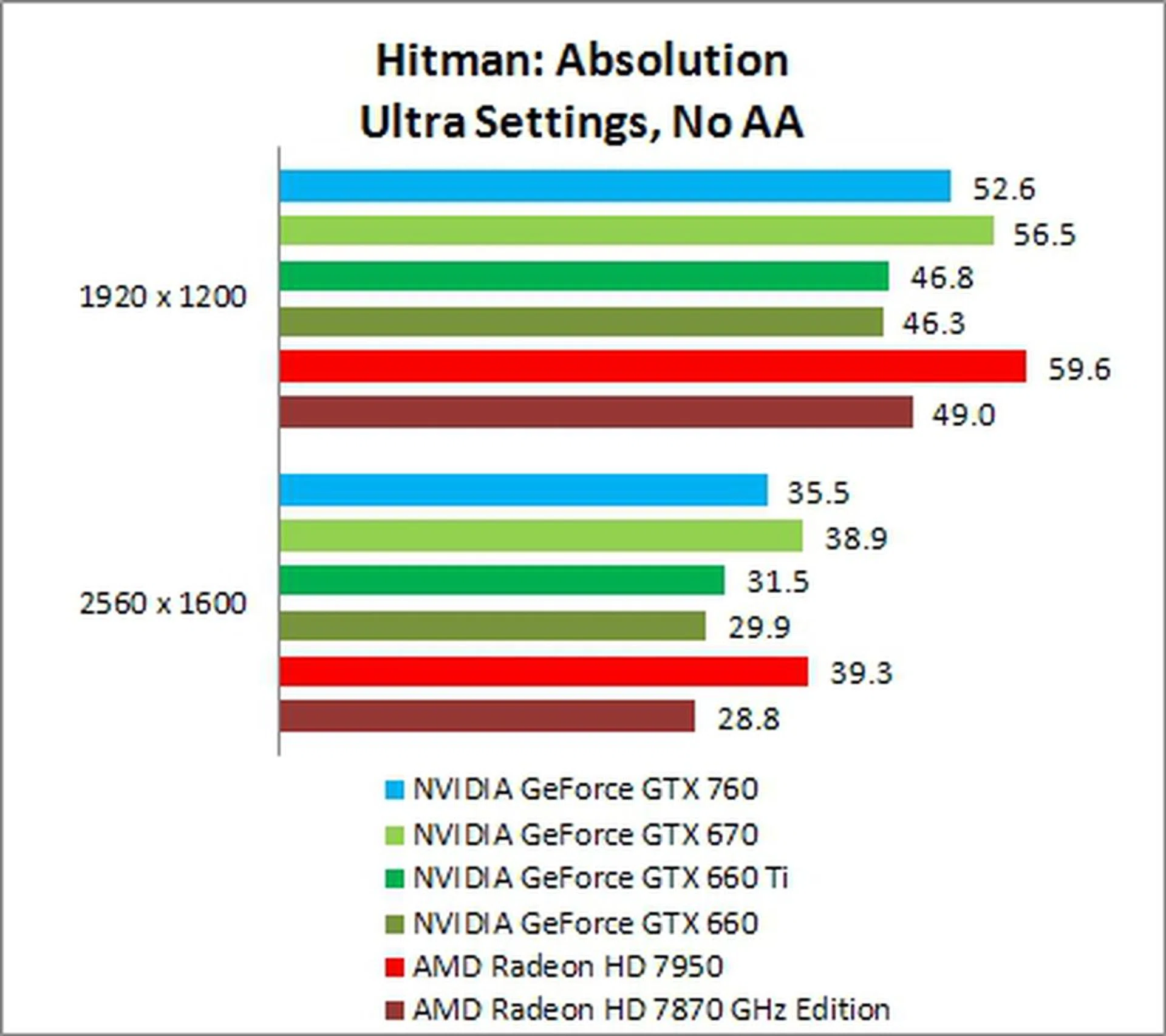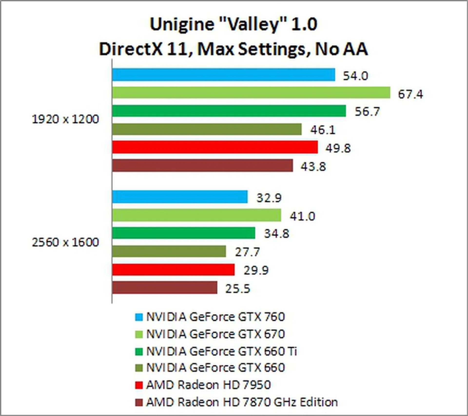 At both screen resolutions, with anti-aliasing disabled, the GTX 760 was able to maintain its lead over the GTX 660 Ti and the AMD Radeon HD cards. However, its lead over them, especially its NVIDIA counterpart, was very thin.