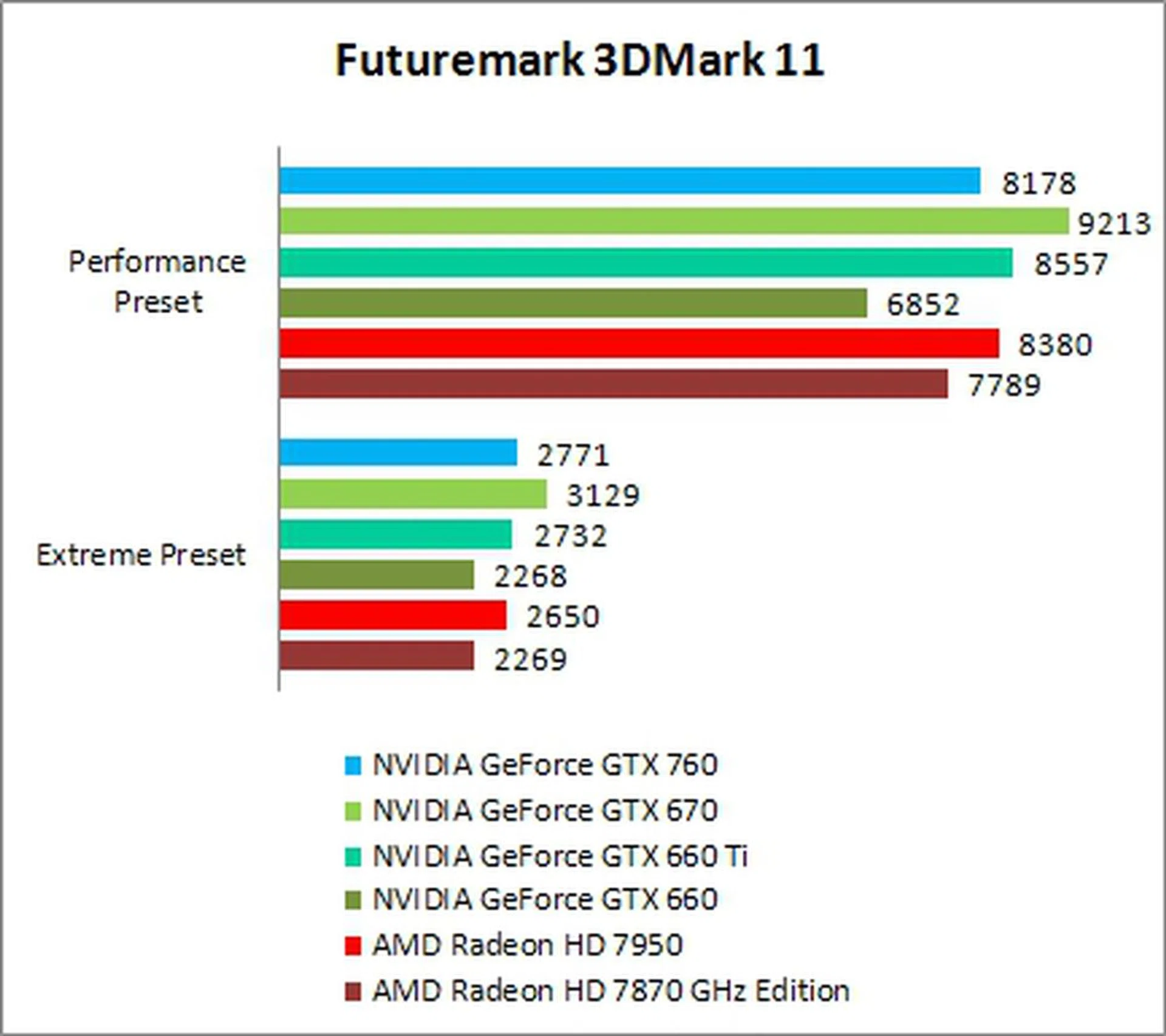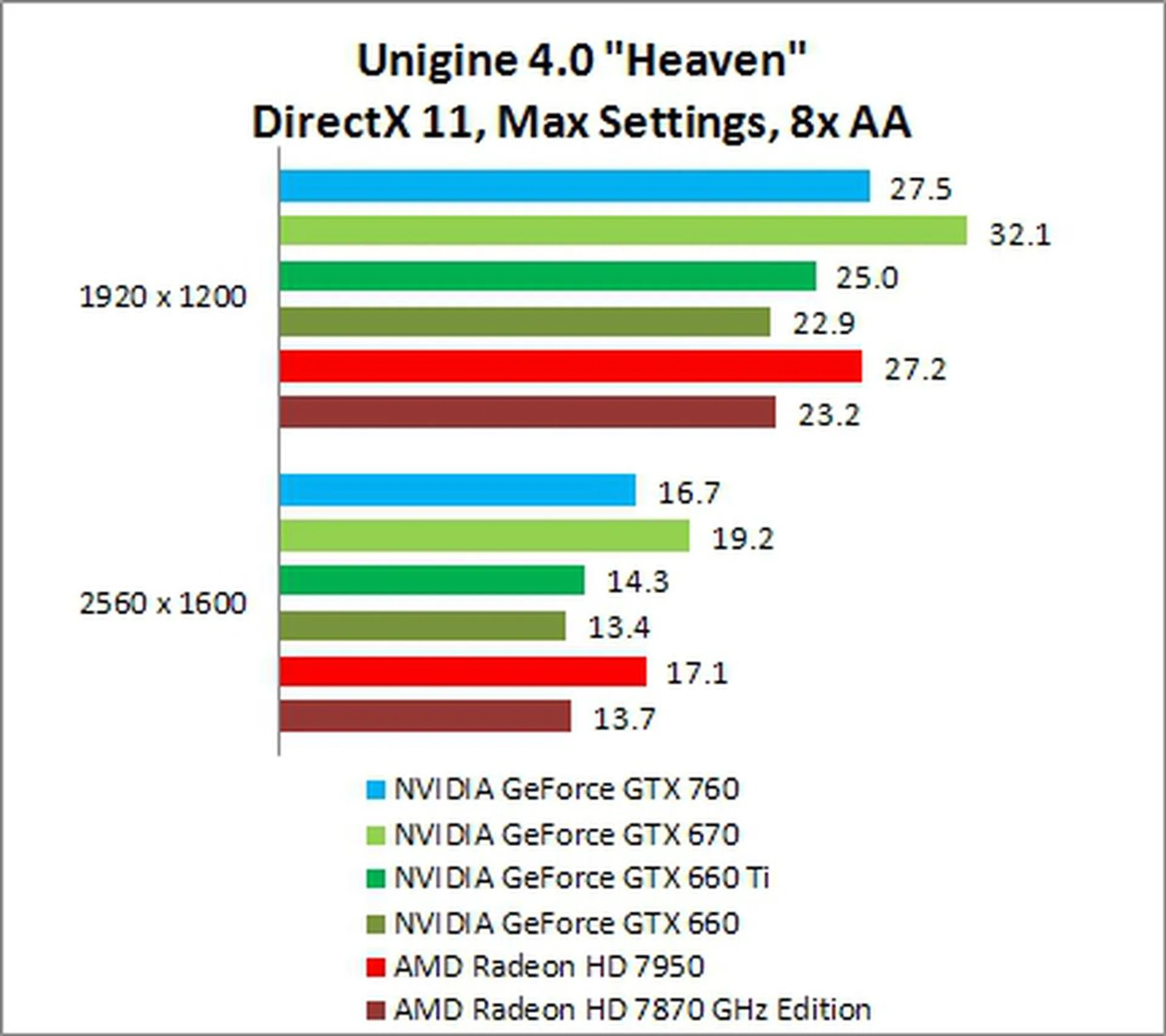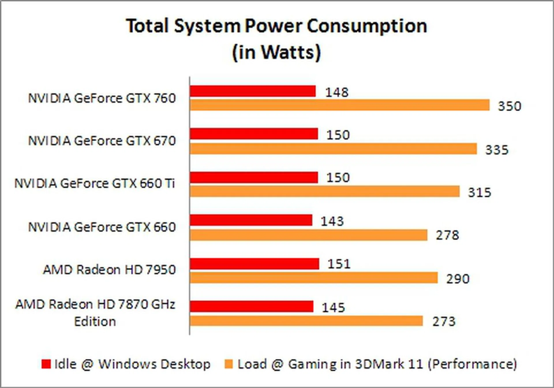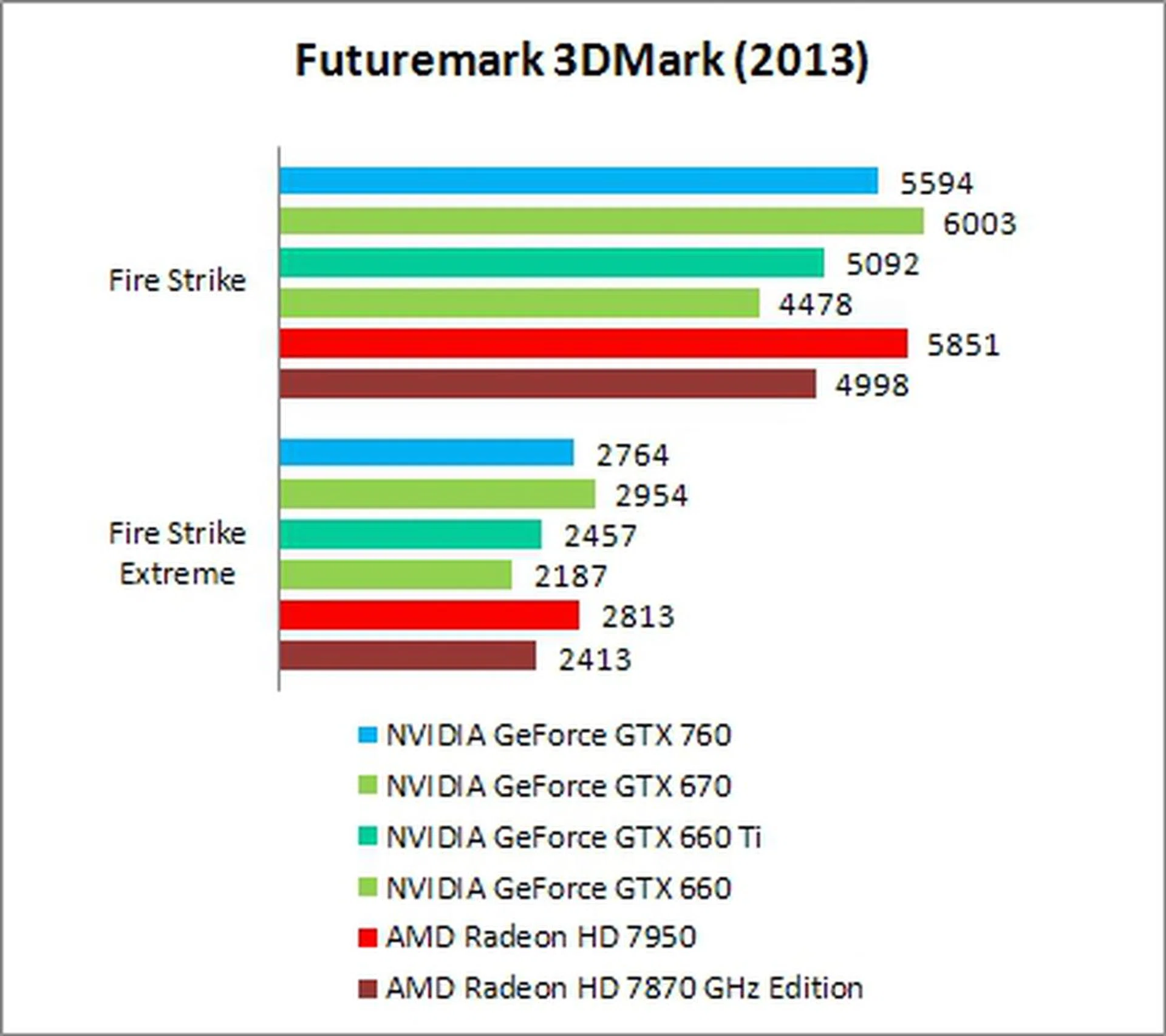 The GTX 760 barely kept ahead of the GTX 660 Ti and AMD Radeon HD 7870, with winning margins that ranged from roughly 4- to 7 per cent. The card was outclassed by the AMD Radeon HD 7950 and the NVIDIA GeForce GTX 670.