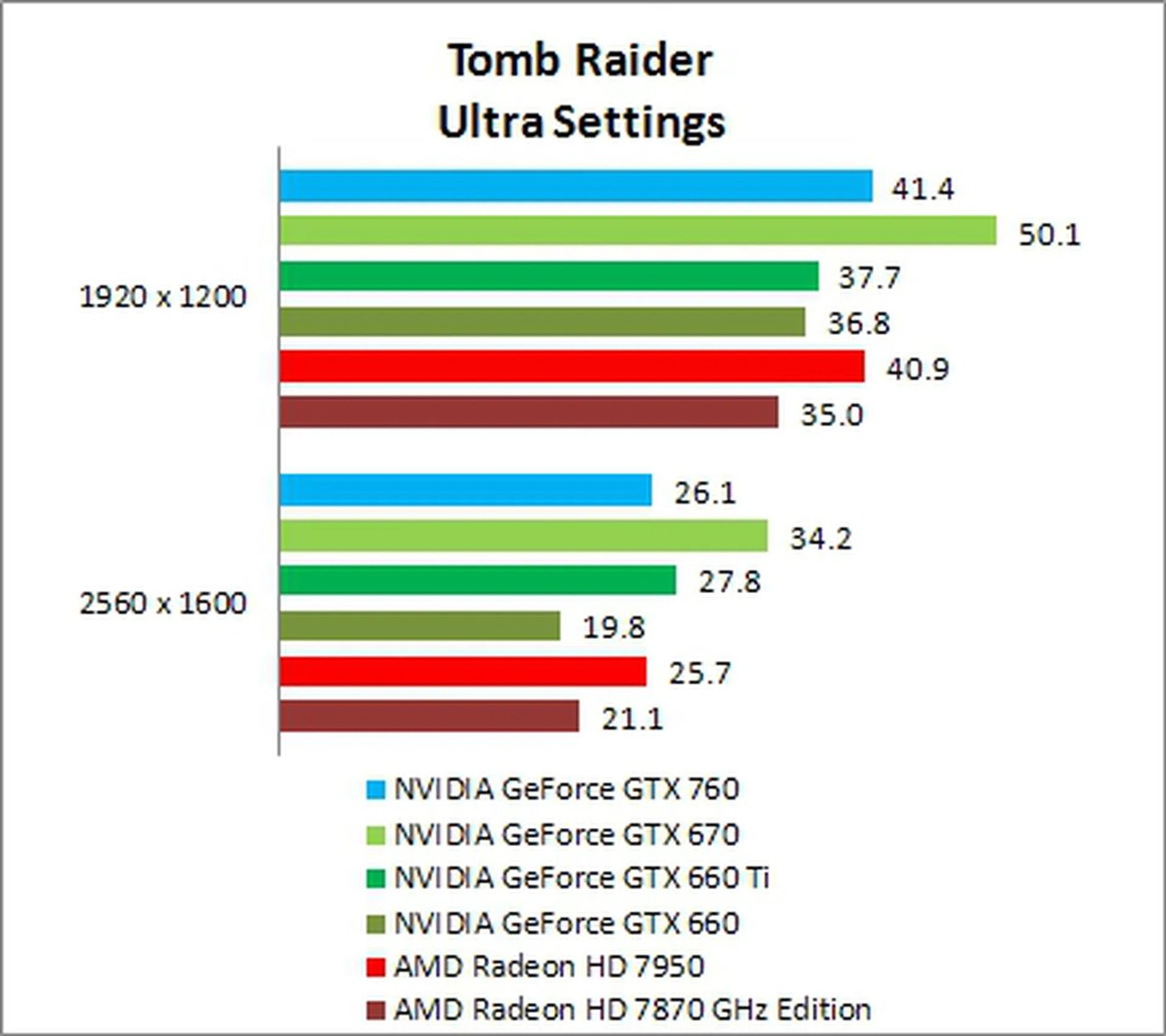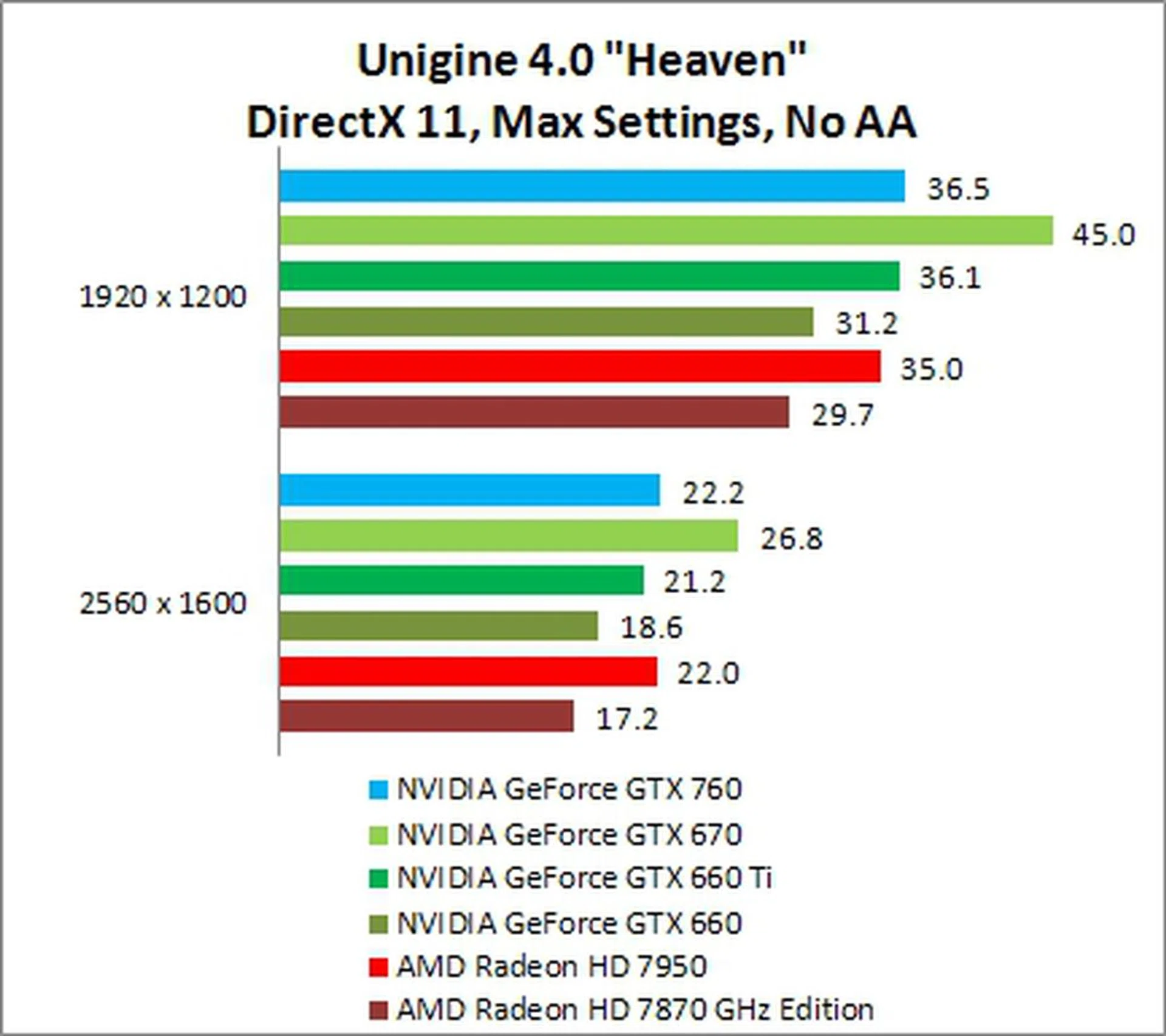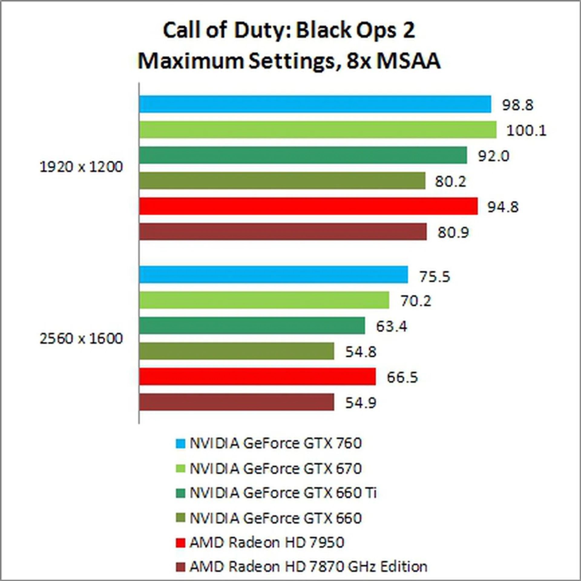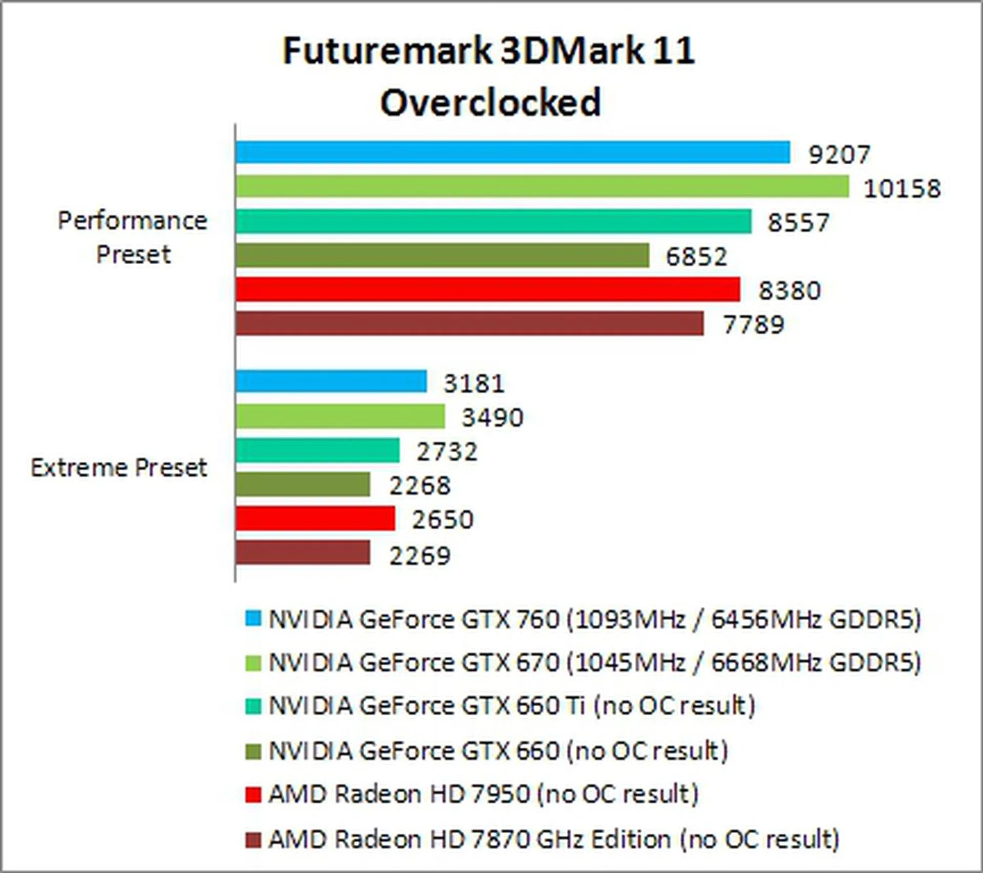 The GTX 760 barely kept ahead of the GTX 660 Ti and AMD Radeon HD 7870, with winning margins that ranged from roughly 4- to 7 per cent. The card was outclassed by the AMD Radeon HD 7950 and the NVIDIA GeForce GTX 670.