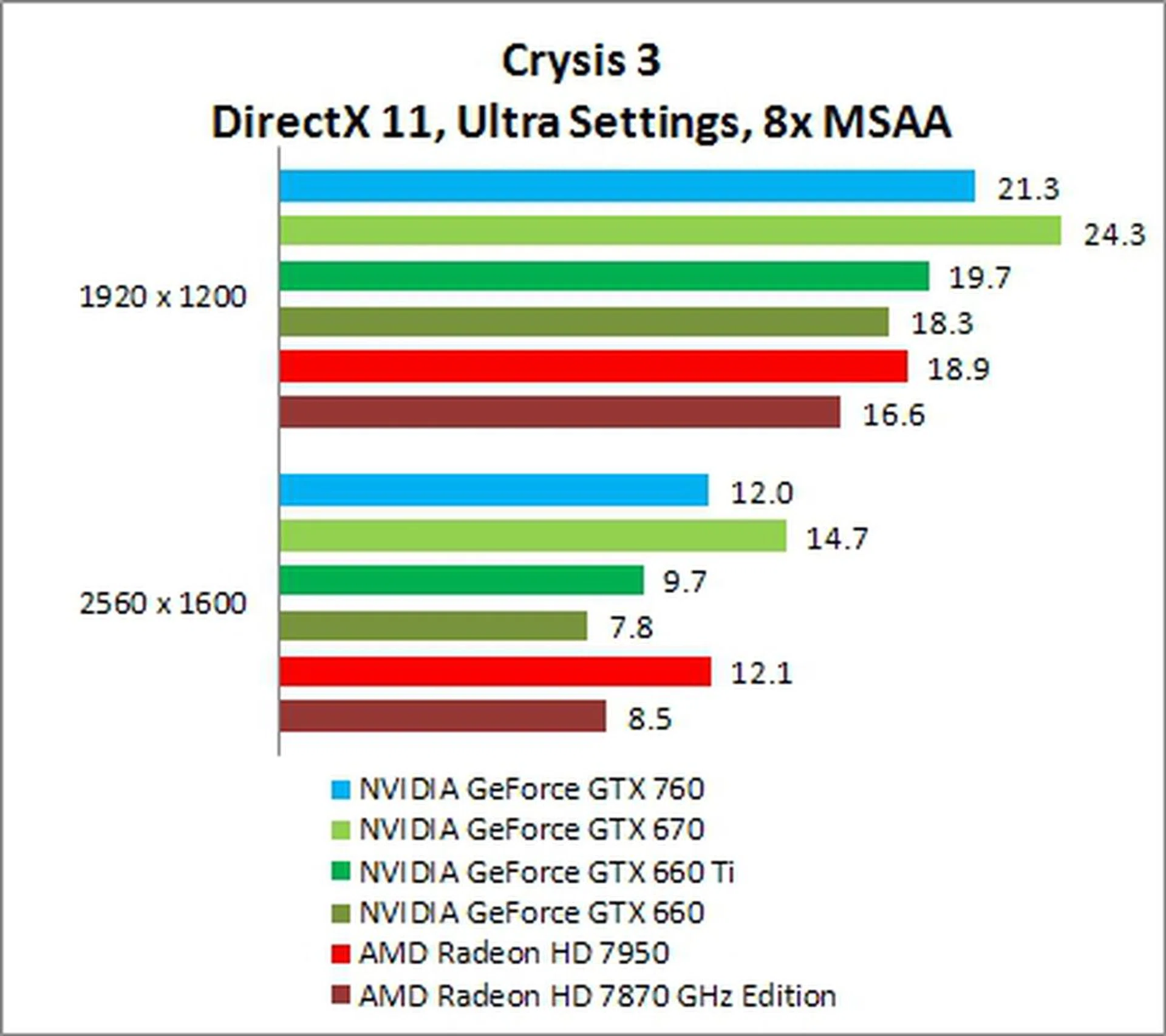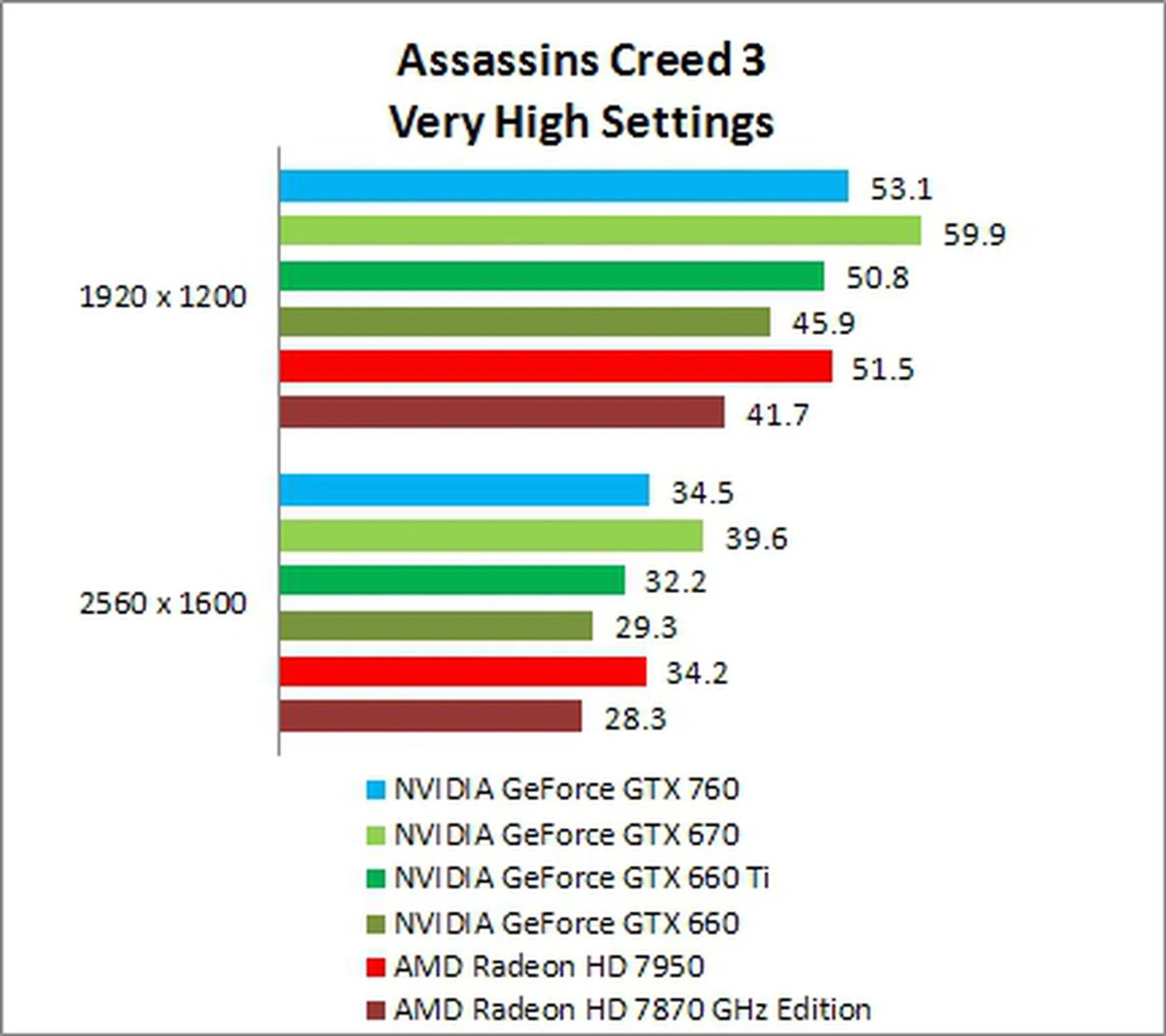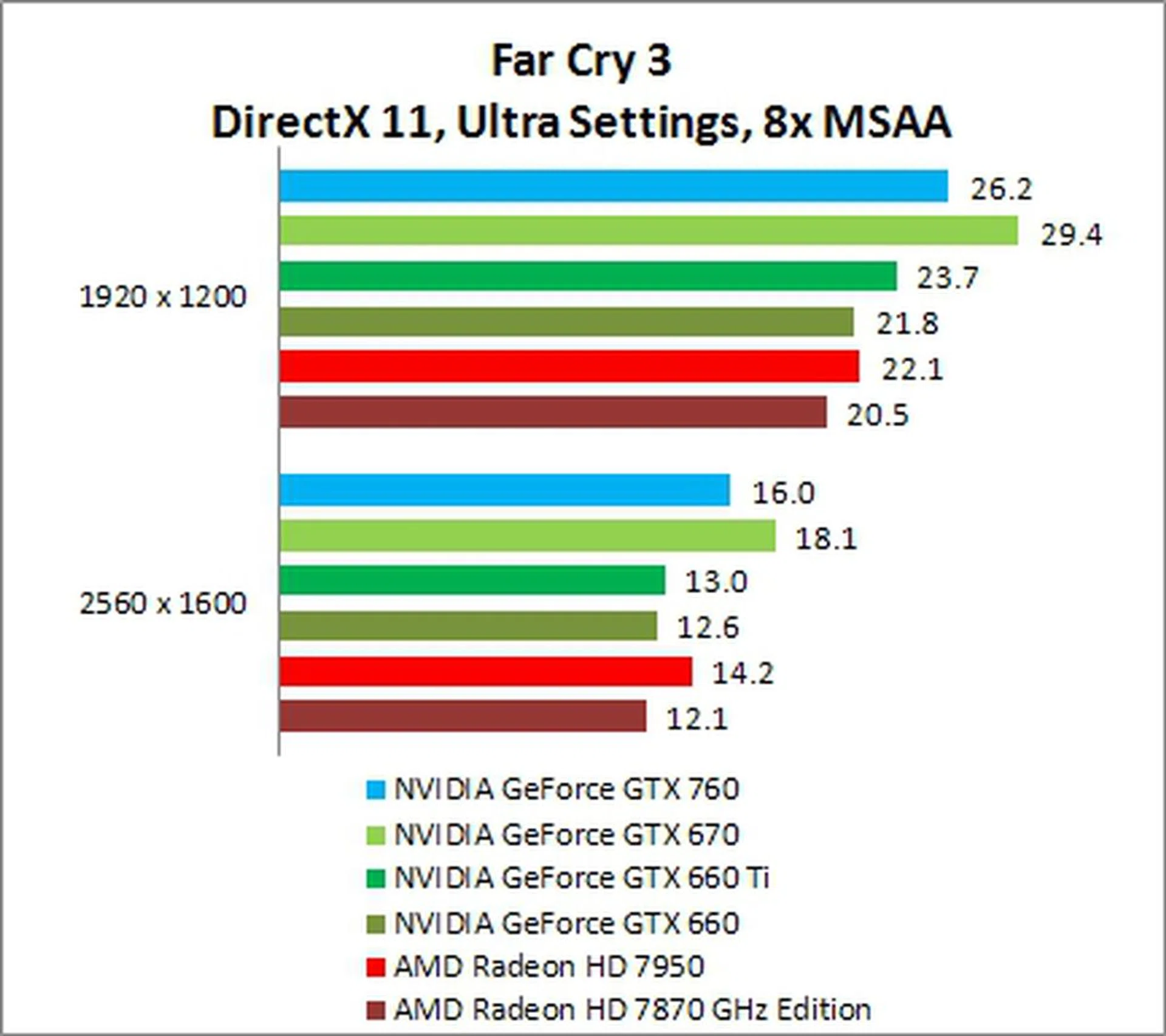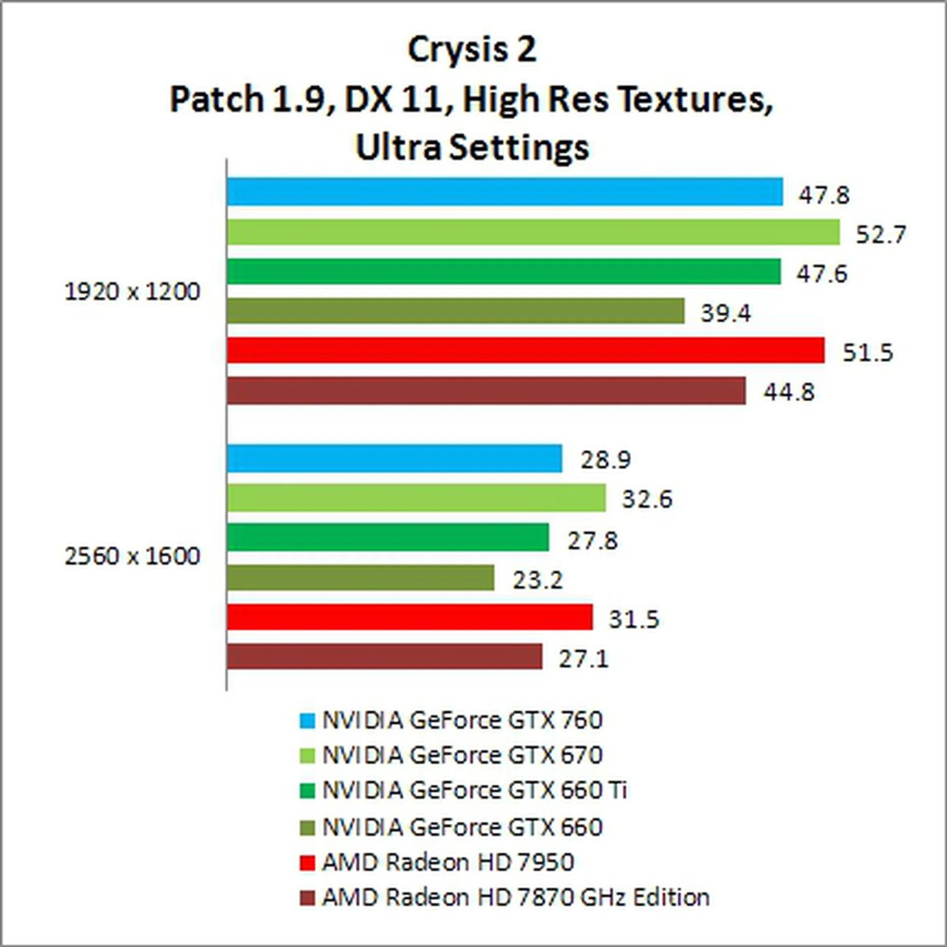 The GTX 760 barely kept ahead of the GTX 660 Ti and AMD Radeon HD 7870, with winning margins that ranged from roughly 4- to 7 per cent. The card was outclassed by the AMD Radeon HD 7950 and the NVIDIA GeForce GTX 670.