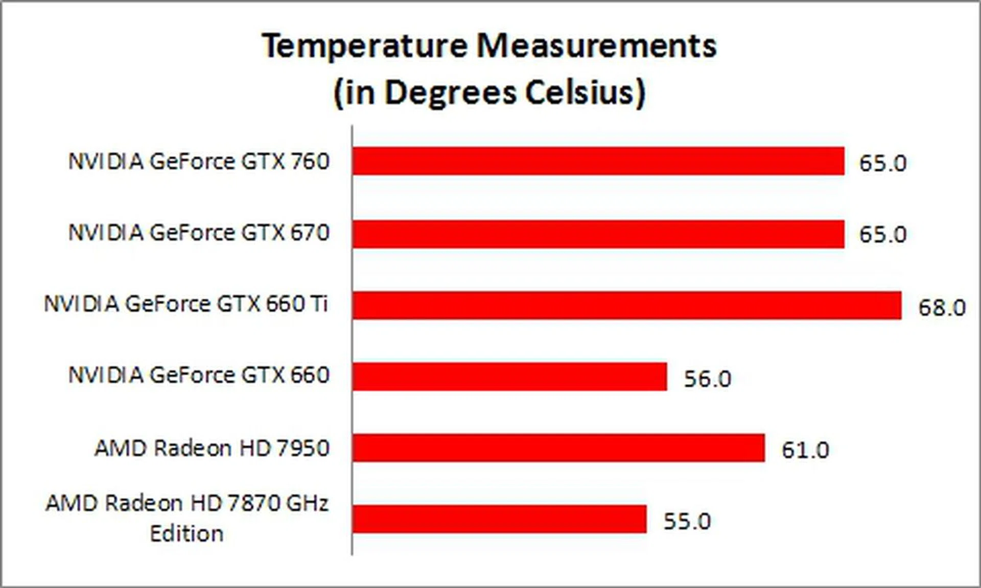 Coincidentally, the maximum recorded temperature, at 65 degrees Celsius, of the GTX 760 was the same as the GTX 670. Take note that the temperature results of the GeForce GTX 660 and the GTX 660 Ti are taken from add-in board partner cards. The recorded temperatures of the AMD Radeon cards and that of the GeForce GTX 670 were taken from reference cards.